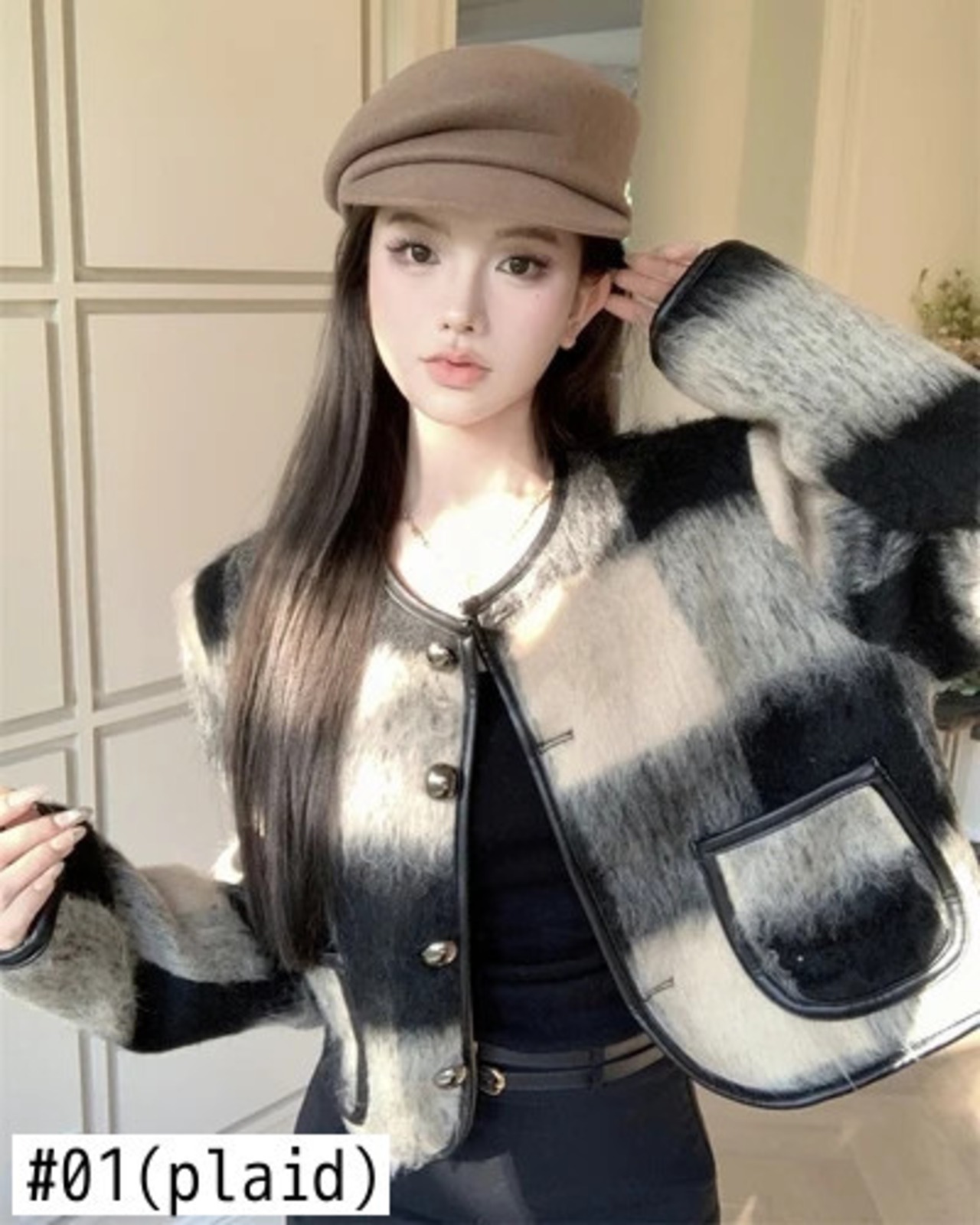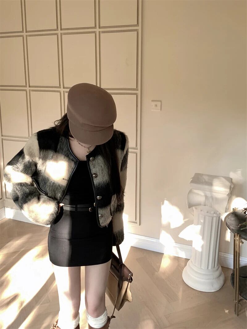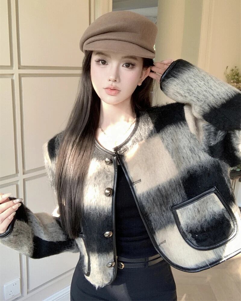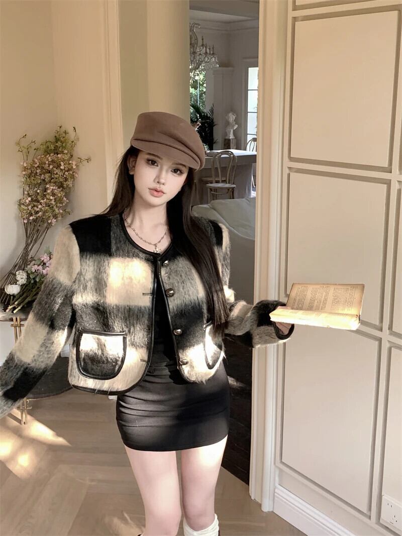甘いホットガールチェック柄ショートウールジャケット秋/冬 O ネック長袖シングルブレストジャケット ロング 大人ガーリー スウィート キュート カジュアル オータム 秋物 ウィンター 冬物 Oネック