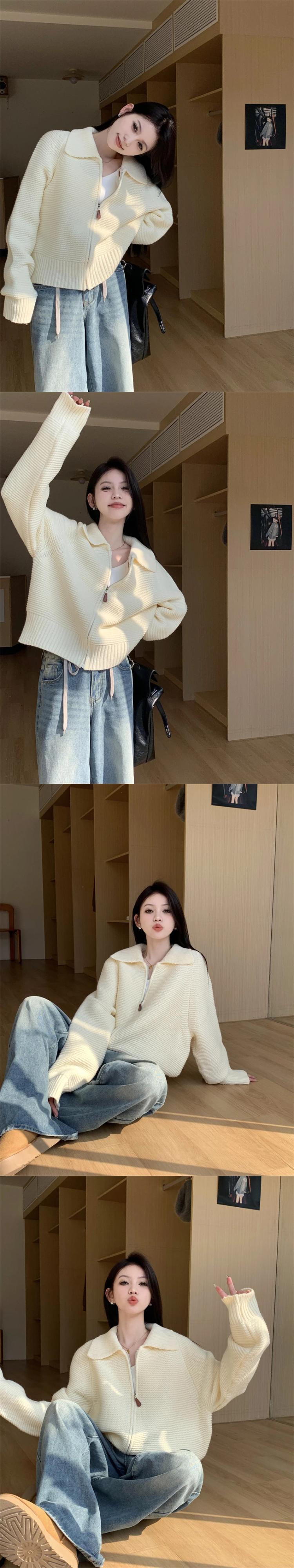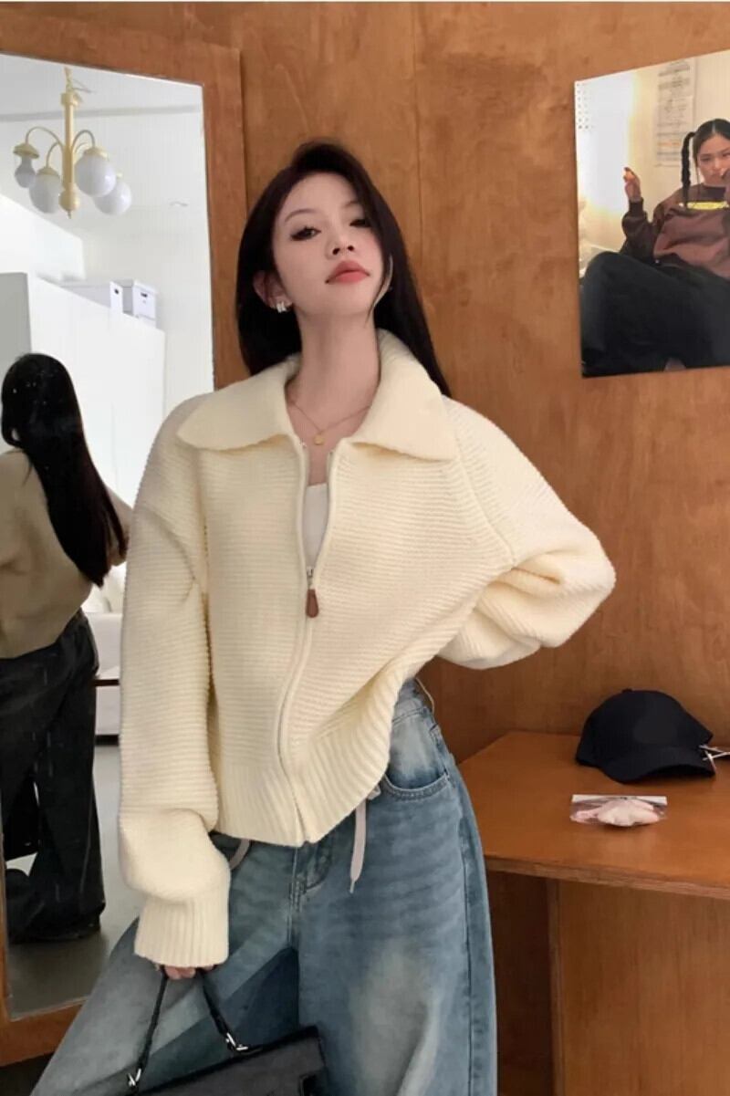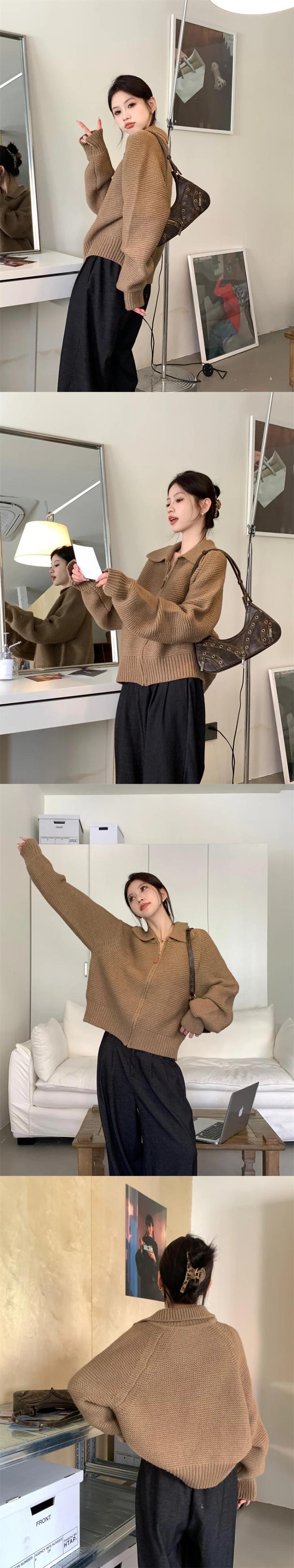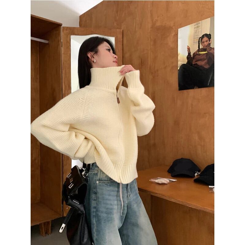 ホットガール肥厚ジッパー長袖セーターコート秋/冬ポロ襟ルーズニットカーディガントップ ロング オータム 秋物 ウィンター 冬物