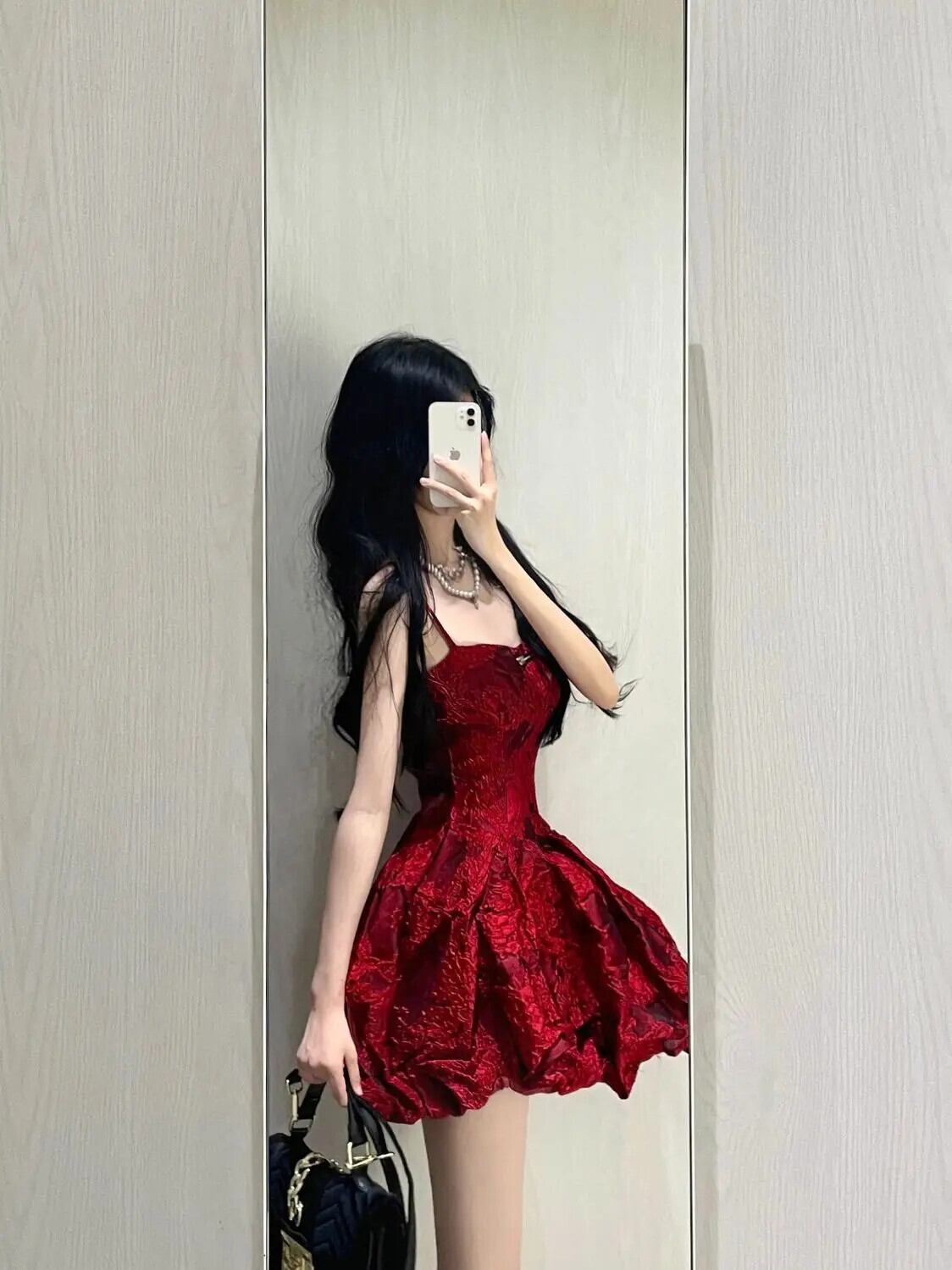 フレンチスウィートホットガールピュアセクシーストラップドレス秋スリムフィットレッドAラインショートボールガウンドレス 大人ガーリー キュート カジュアル オータム 秋物