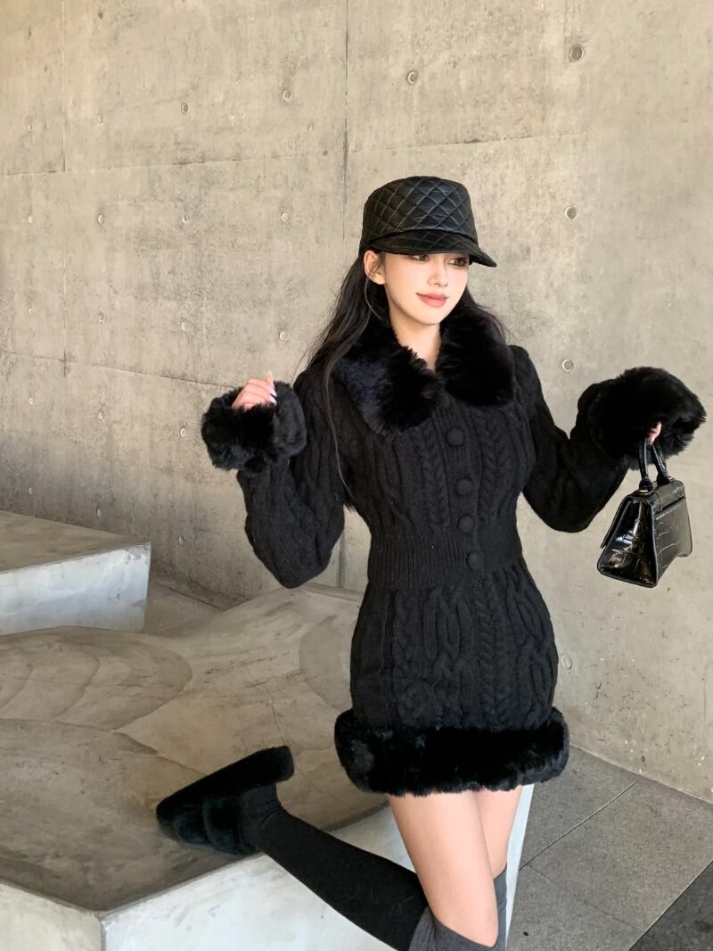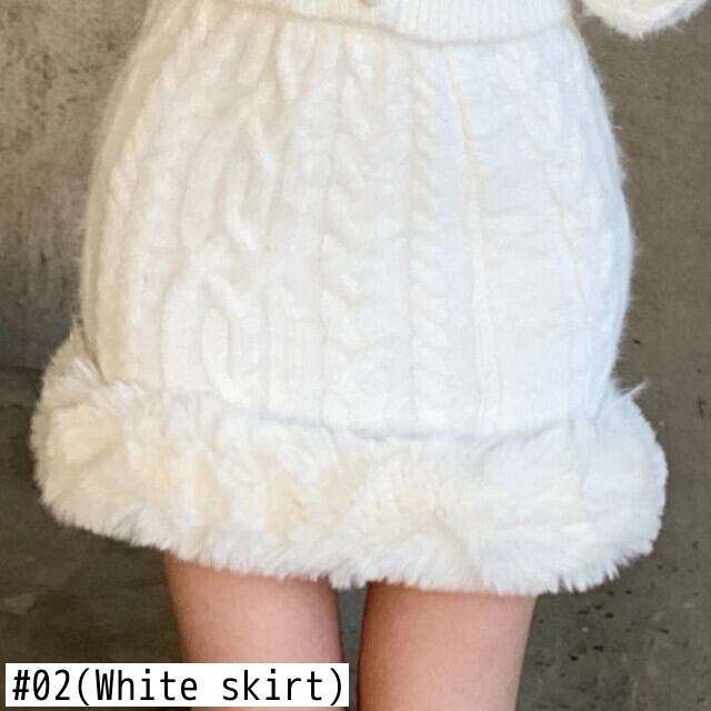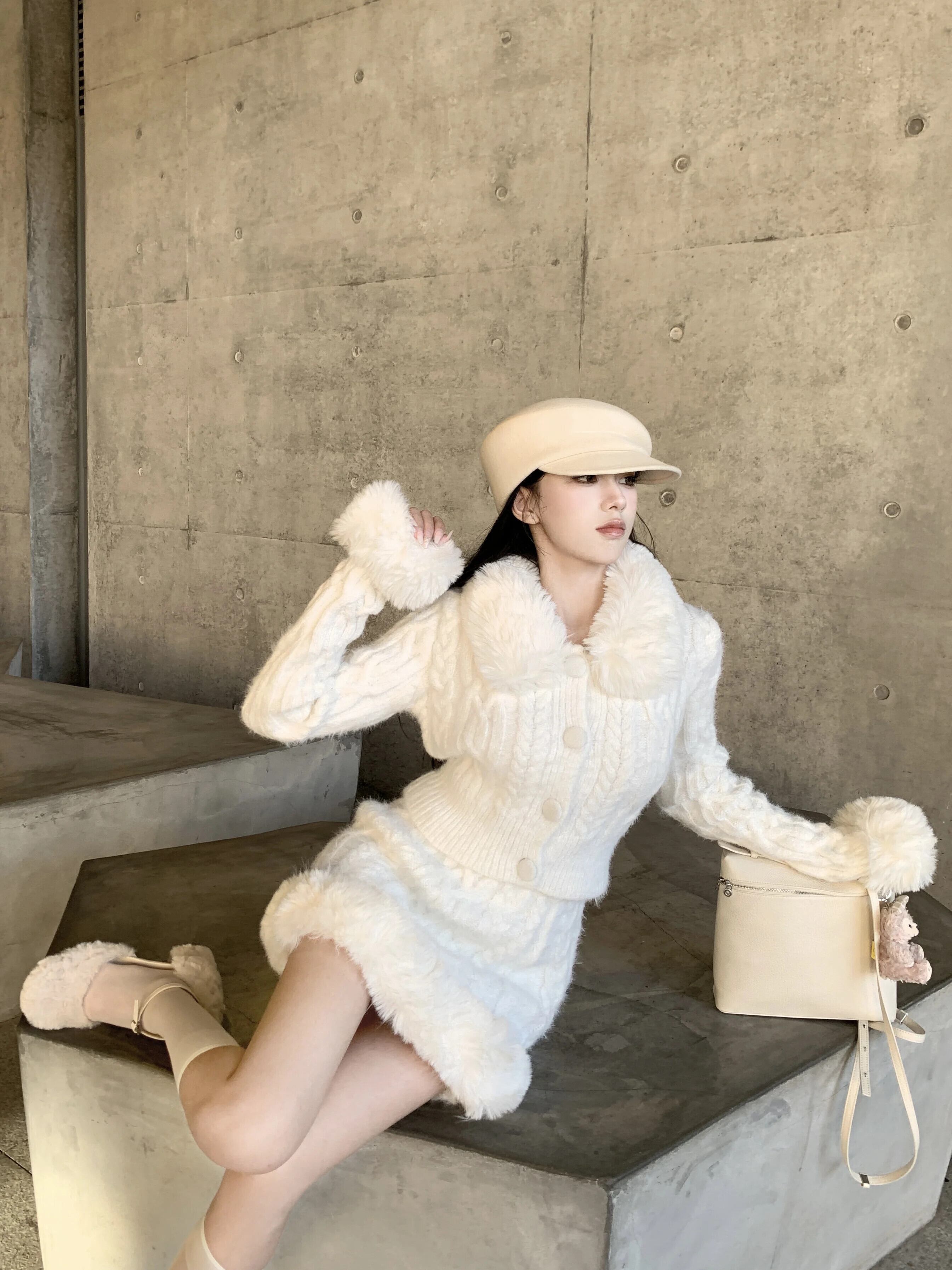 甘いホットガールスーツ秋/冬白ニット長袖ファー襟コートウエストミニスカート 2 点セット ロング ホワイト 大人ガーリー スウィート キュート カジュアル オータム 秋物 ウィンター 冬物