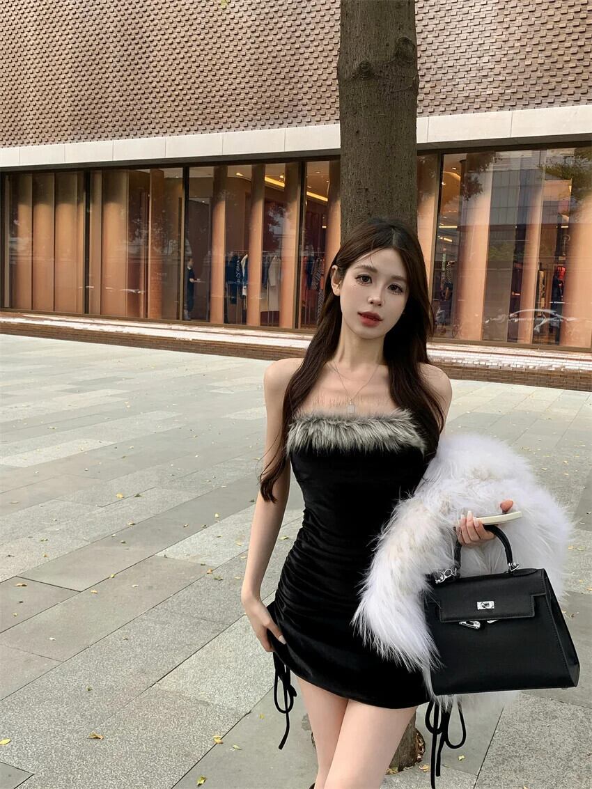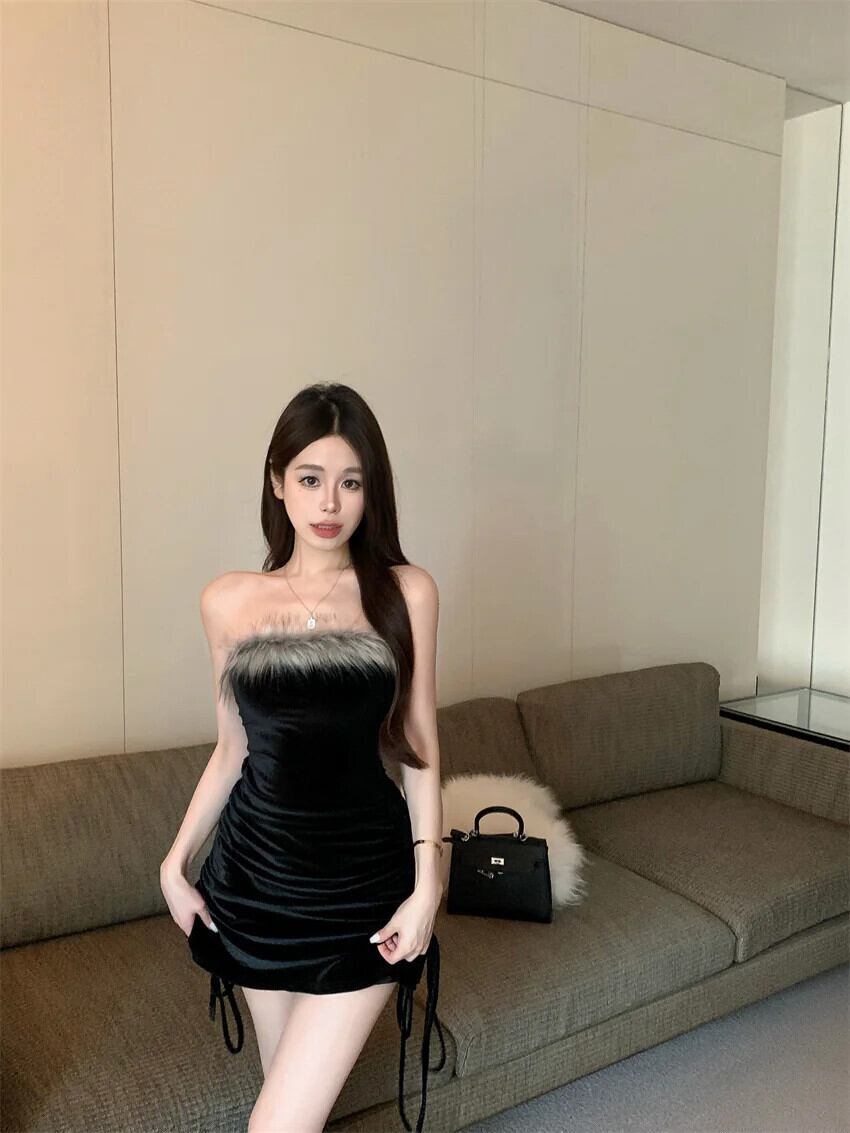 純粋セクシーストラップレスドレス秋/冬毛皮パッチワーク巾着ノースリーブラップヒップショートドレス オータム 秋物 ウィンター 冬物