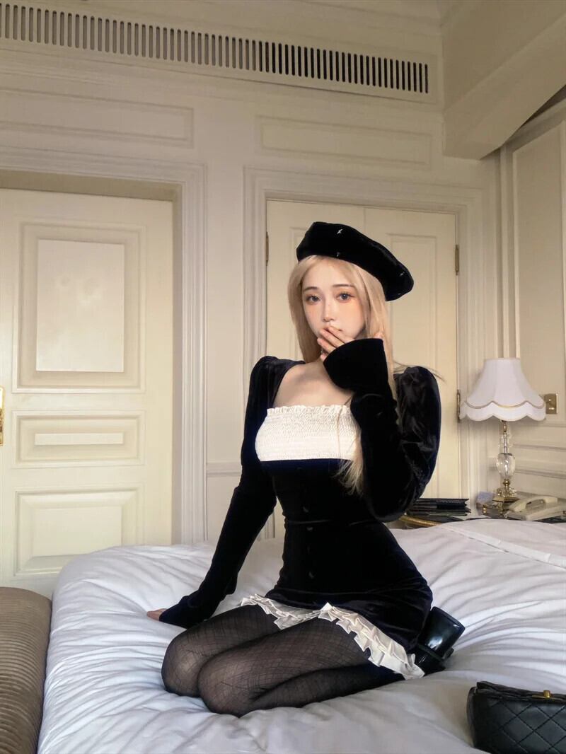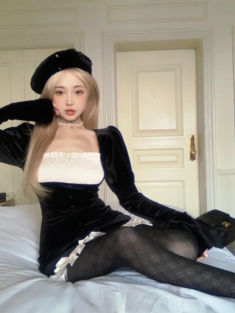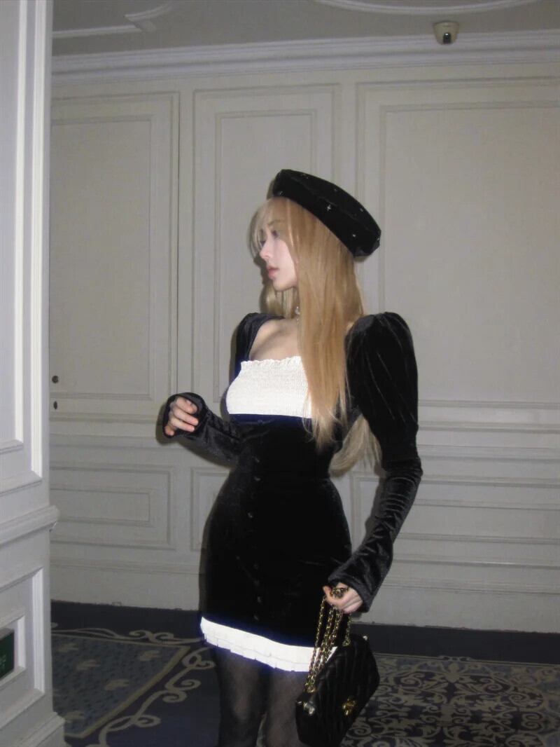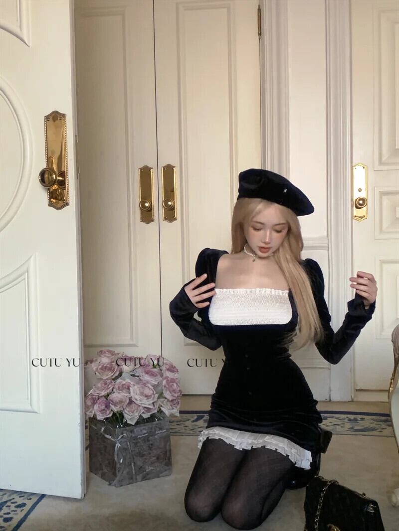 Sweet Girl ベルベットコントラストバブルスリーブドレス秋/冬スクエアカラータイトラップヒップショートドレス 大人ガーリー スウィート キュート カジュアル オータム 秋物 ウィンター 冬物 スクウェア