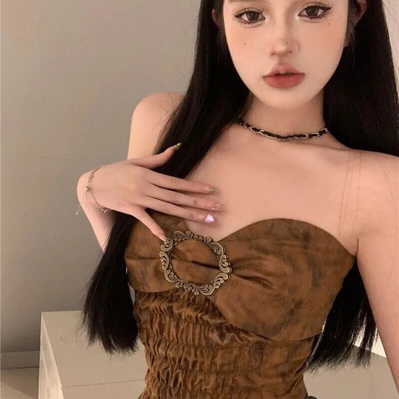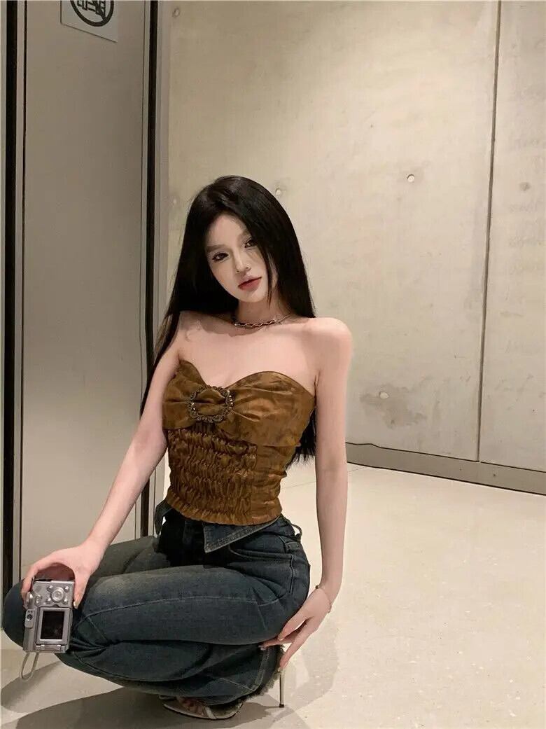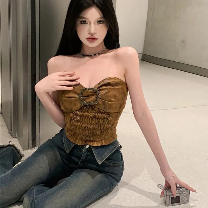 甘いホットガールレトロセクシースリムフィットタンク夏ストラップレスラップ胸オフショルダーショートトップ 大人ガーリー スウィート キュート カジュアル サマー 夏物