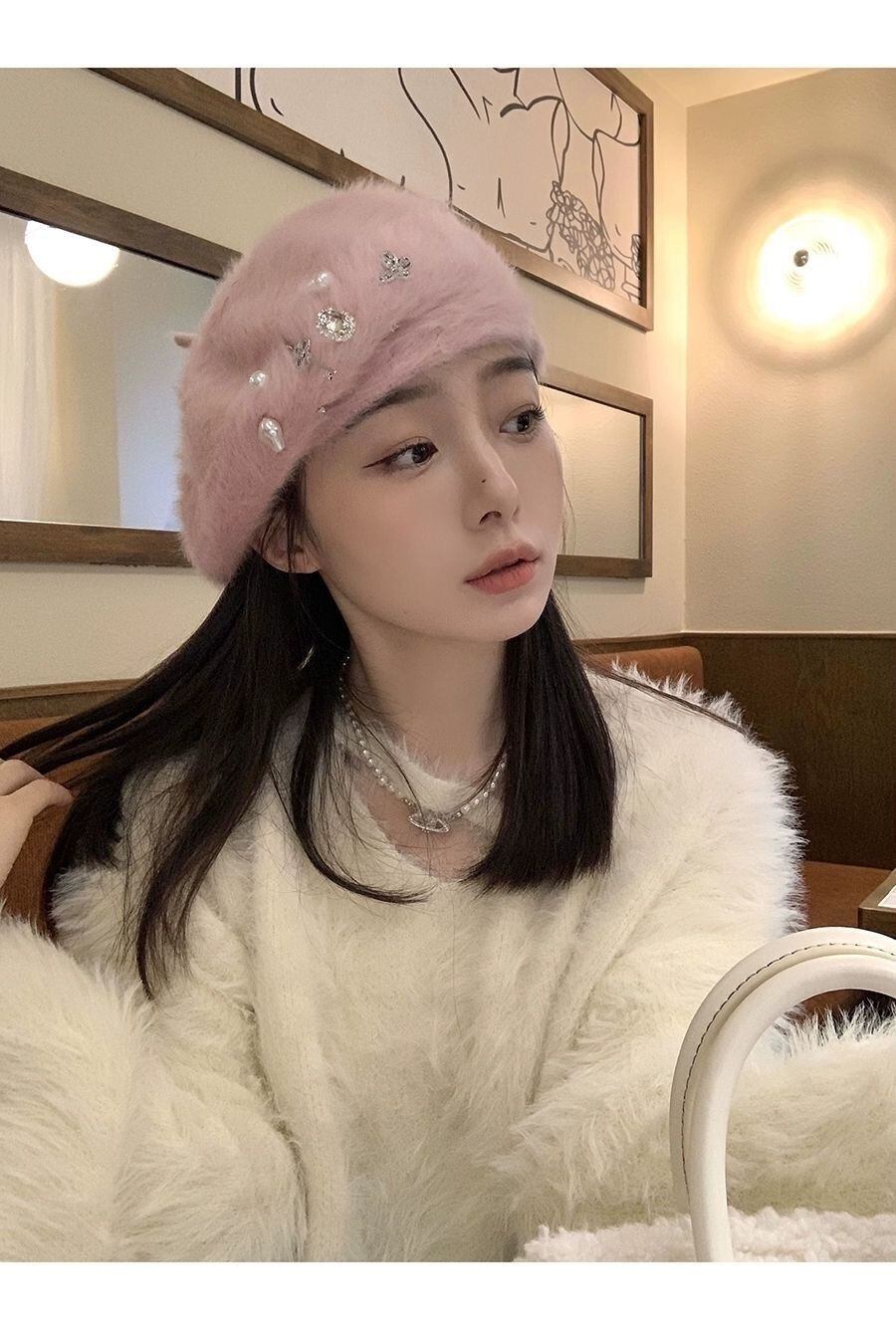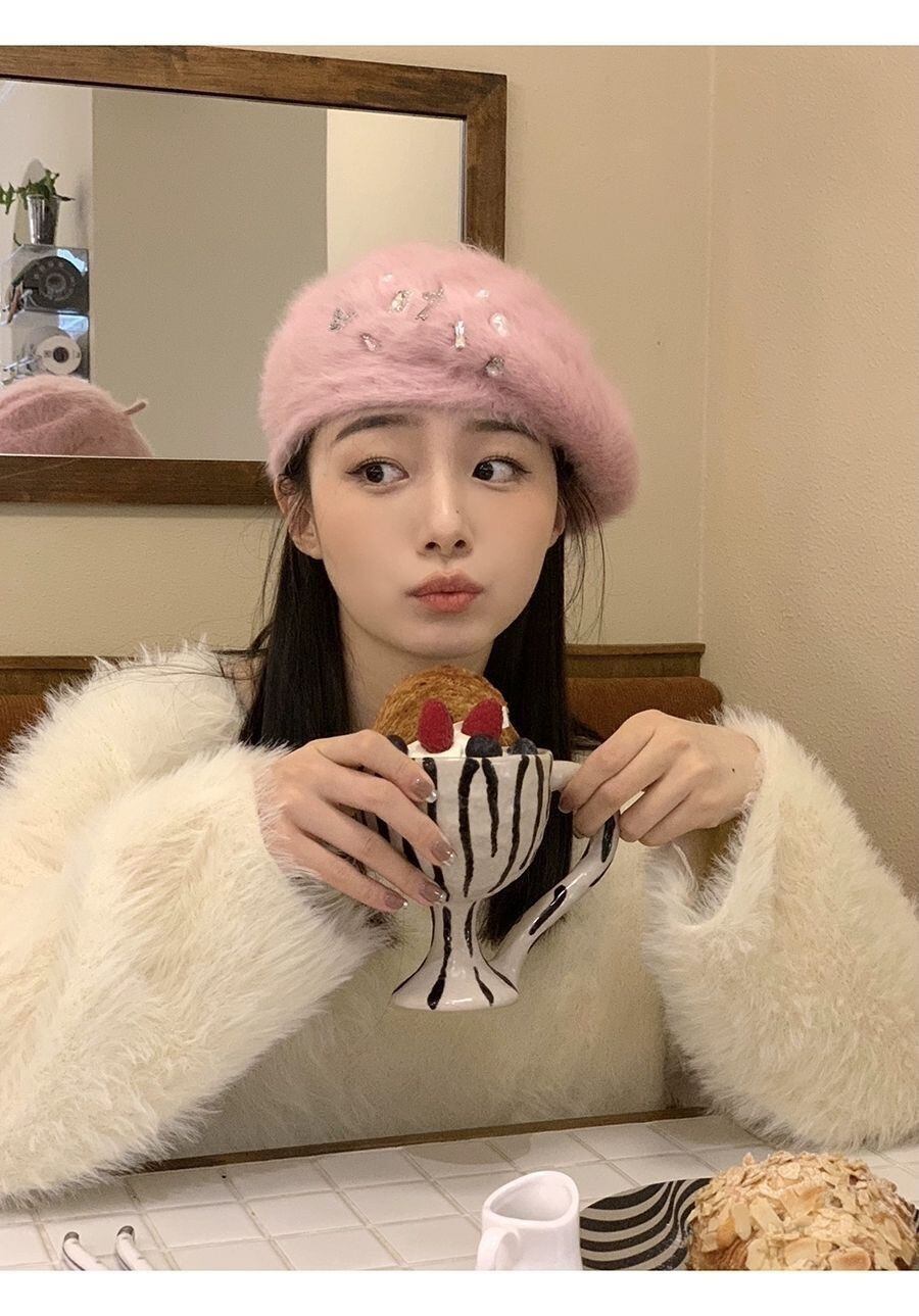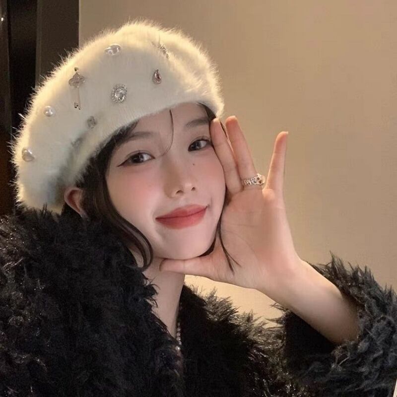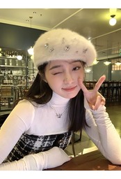 K-pop ガールズグループラインストーンウサギヘアベレー帽秋/冬ぬいぐるみ白ニットベレー帽トレンディアクセサリー ホワイト オータム 秋物 ウィンター 冬物 ベレット ヘアアクセサリー