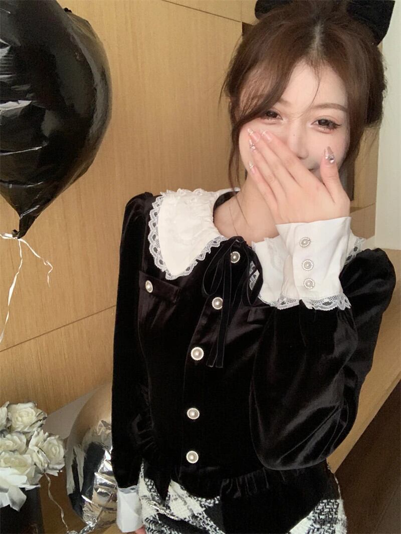 スイートガールスーツ秋/冬ベルベット長袖ショートコートウエストチェック柄スカートツーピースセット ロング 大人ガーリー スウィート キュート カジュアル オータム 秋物 ウィンター 冬物