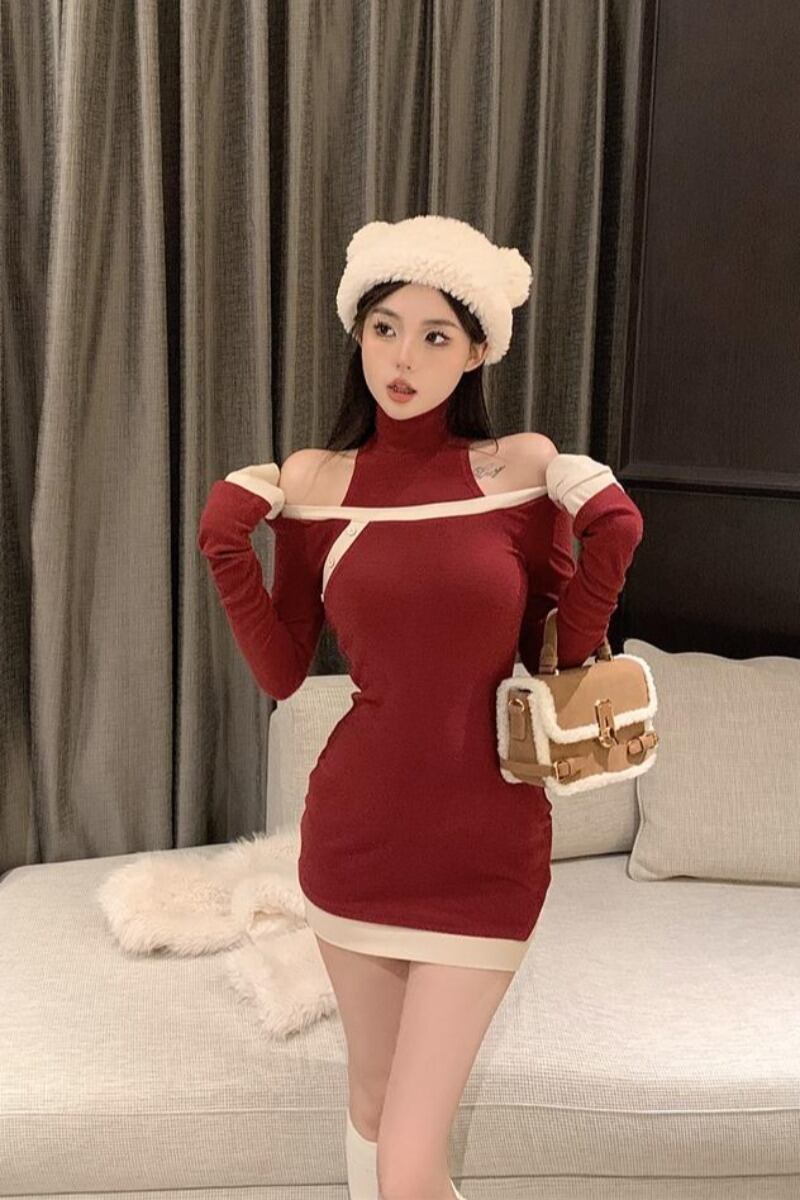 純粋セクシーホットガールクリスマスホルターネックドレス秋/冬スリムフィット長袖ラップヒップショートドレス Feamle ロング オータム 秋物 ウィンター 冬物
