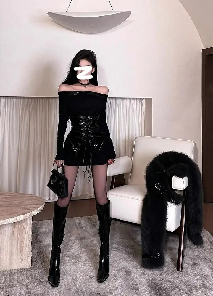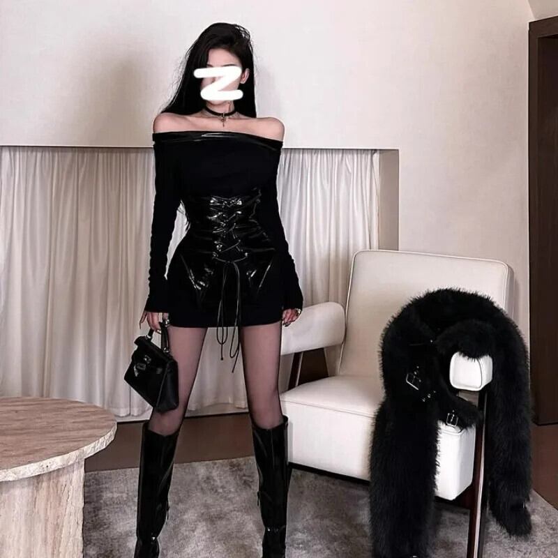 ホットガールスラッシュネックスリムフィットラップヒップドレス秋/冬オフショルダーレースアップスプライシングショートドレス オータム 秋物 ウィンター 冬物