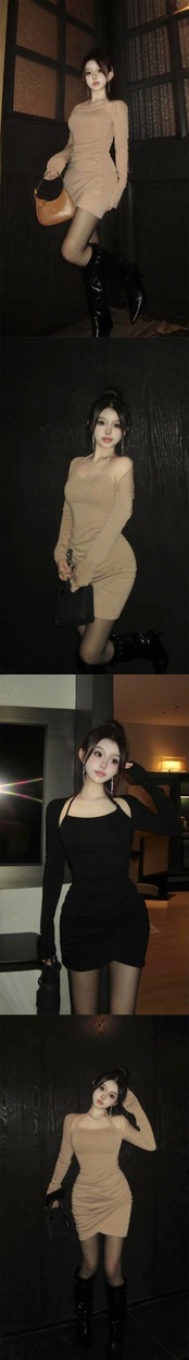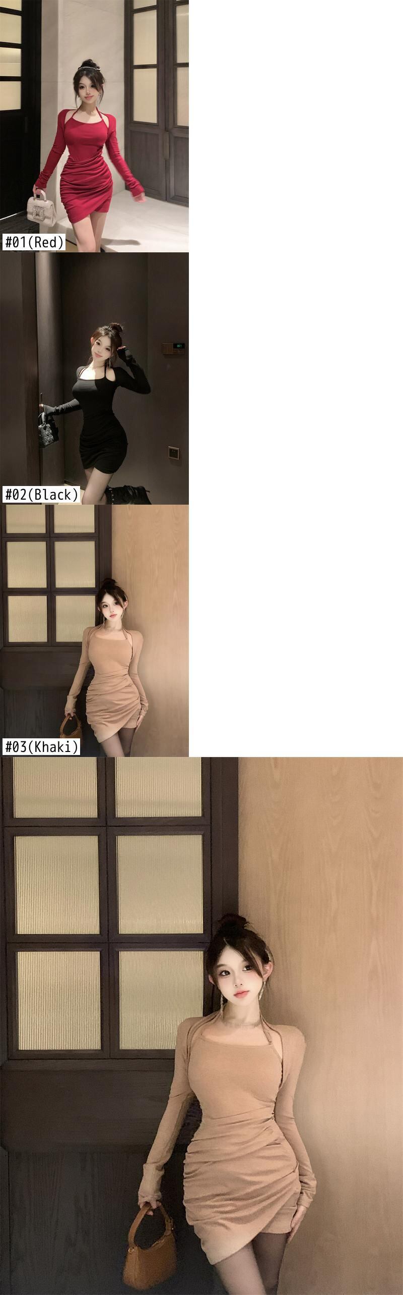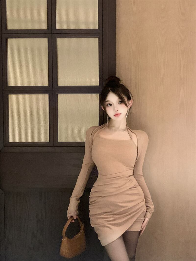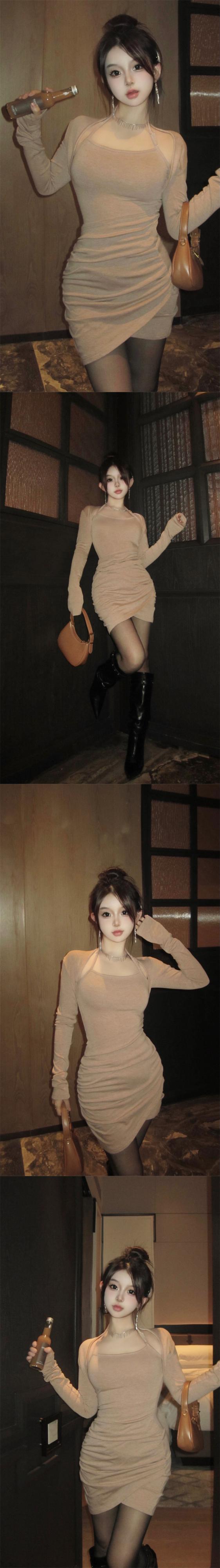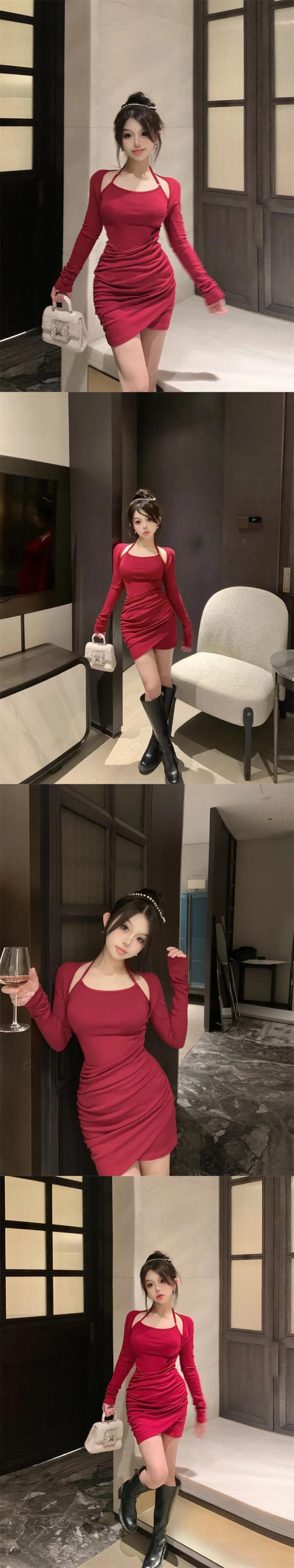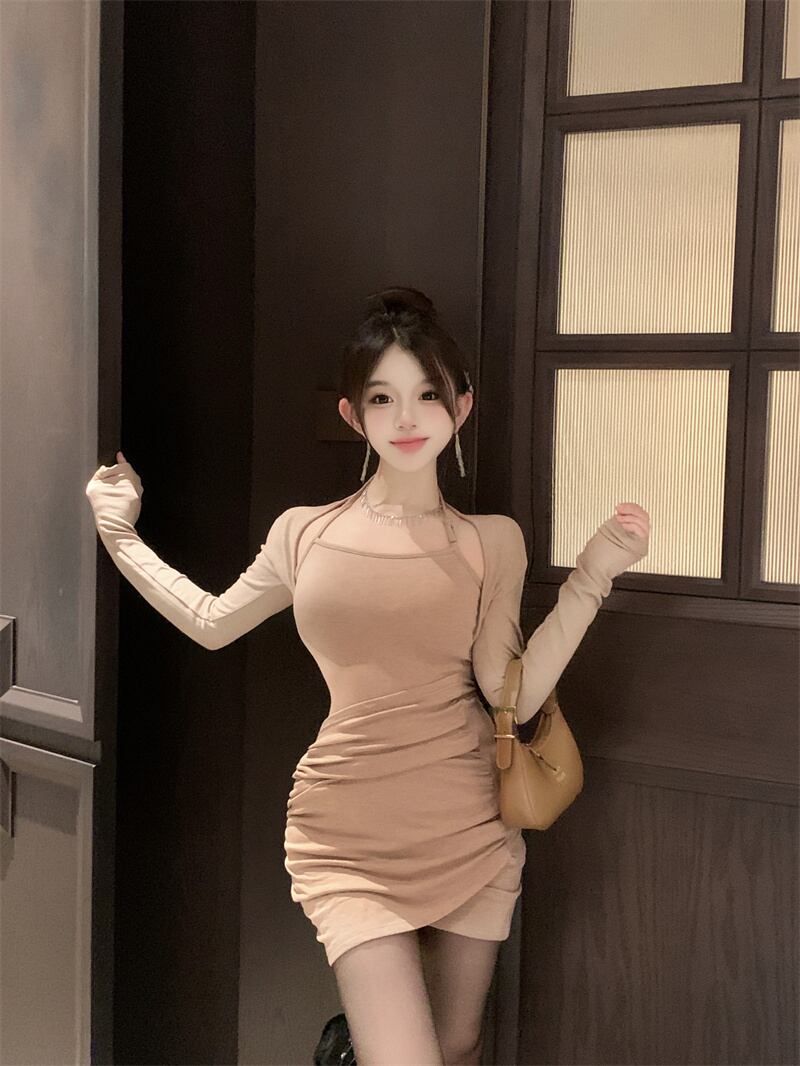 ホットガール偽 2 ピースホルターネックドレス秋と冬長袖プリーツタイトラップヒップショートドレス ロング オータム 秋物 ウィンター 冬物