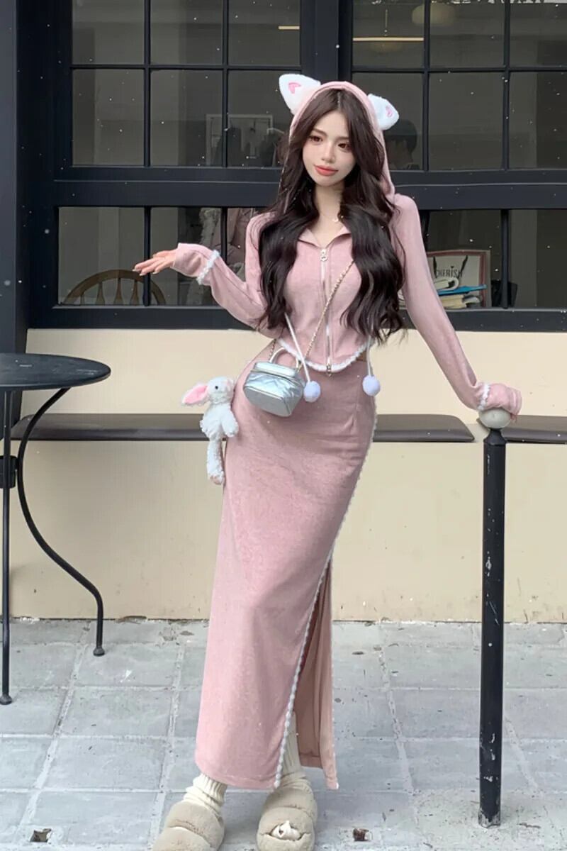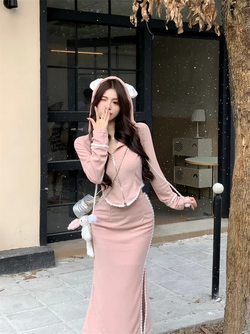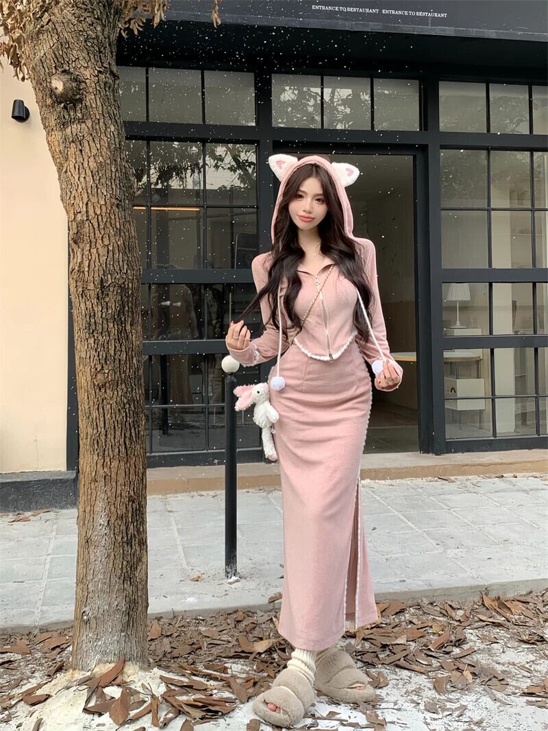甘いホットガールスーツ秋/冬フード付きスリムフィットトップウエストマーメイドロングスカートツーピースセット 大人ガーリー スウィート キュート カジュアル オータム 秋物 ウィンター 冬物