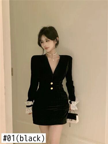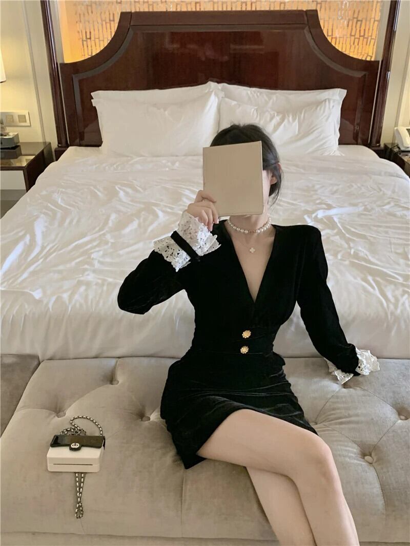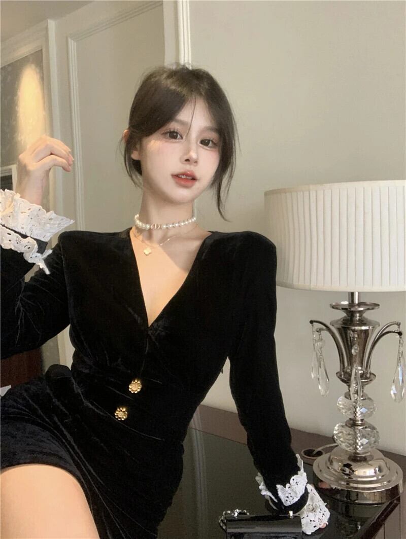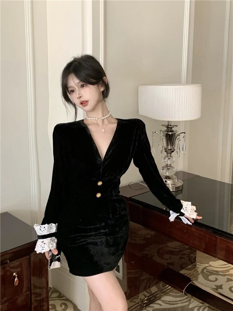 スタイル甘いホットガールベルベットレーススプライスドレス秋 V ネックスリムフィットニットショートドレス 大人ガーリー スウィート キュート カジュアル オータム 秋物 Vネック