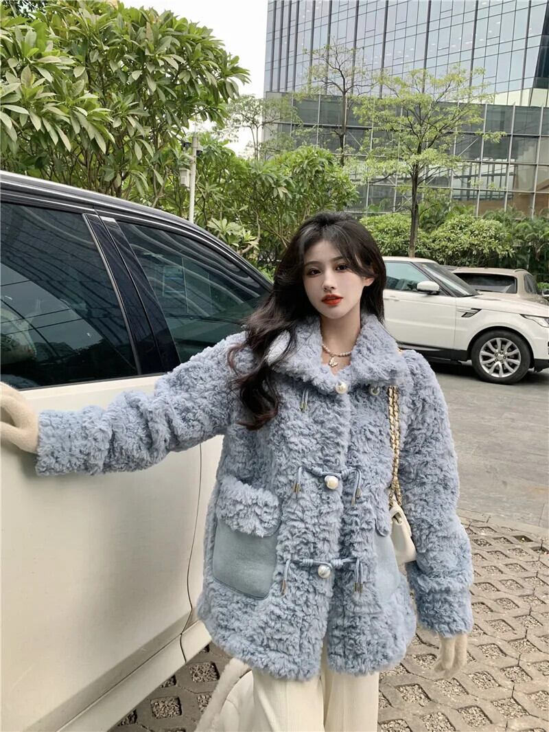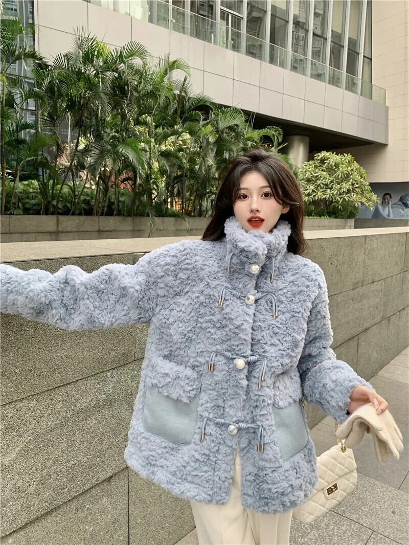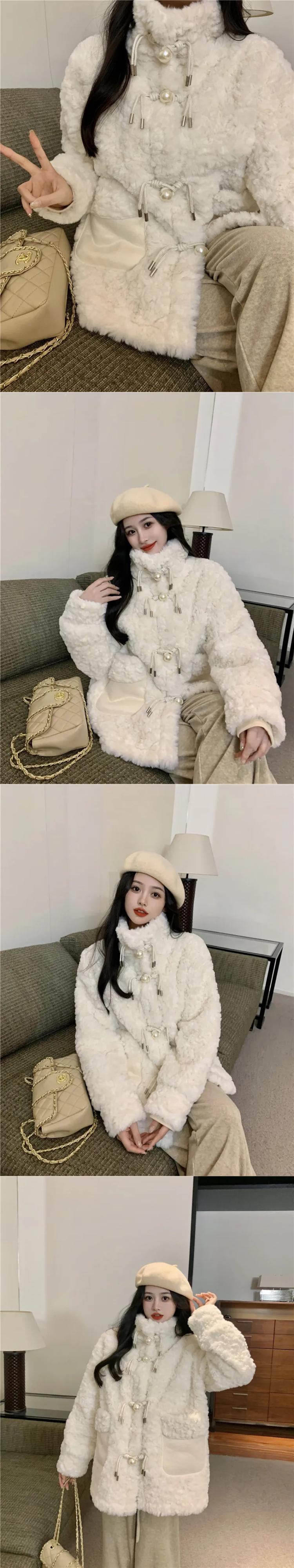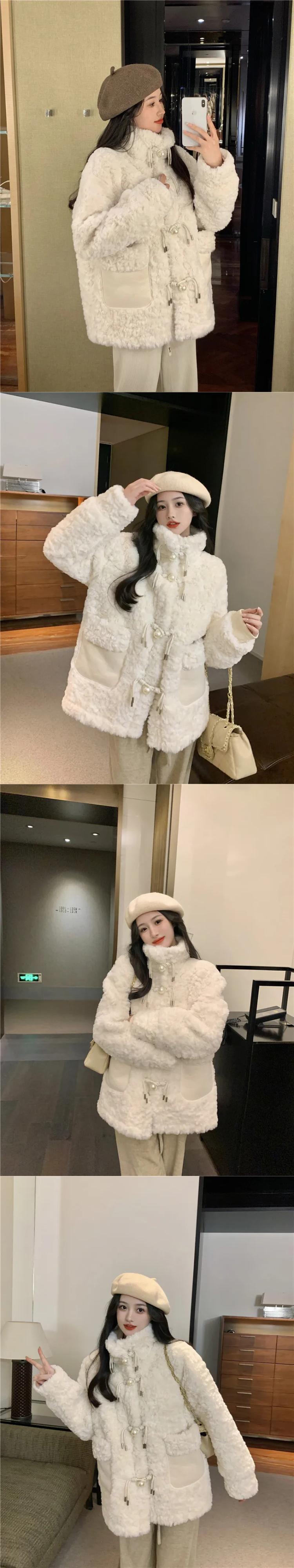 甘いホットガールスプライシングポケットスタンドカラーフェイクファーコート秋ミッドレングスラムウール暖かいジャケット 大人ガーリー スウィート キュート カジュアル オータム 秋物