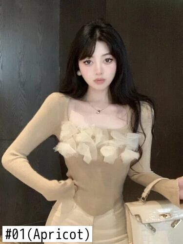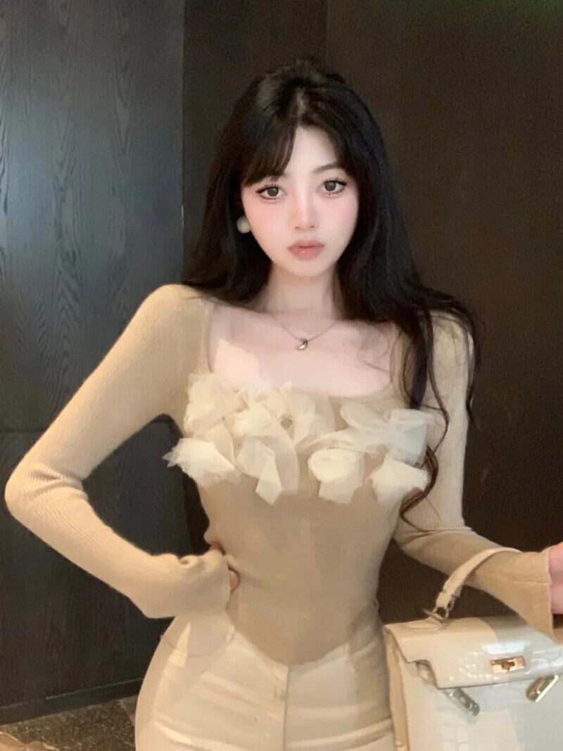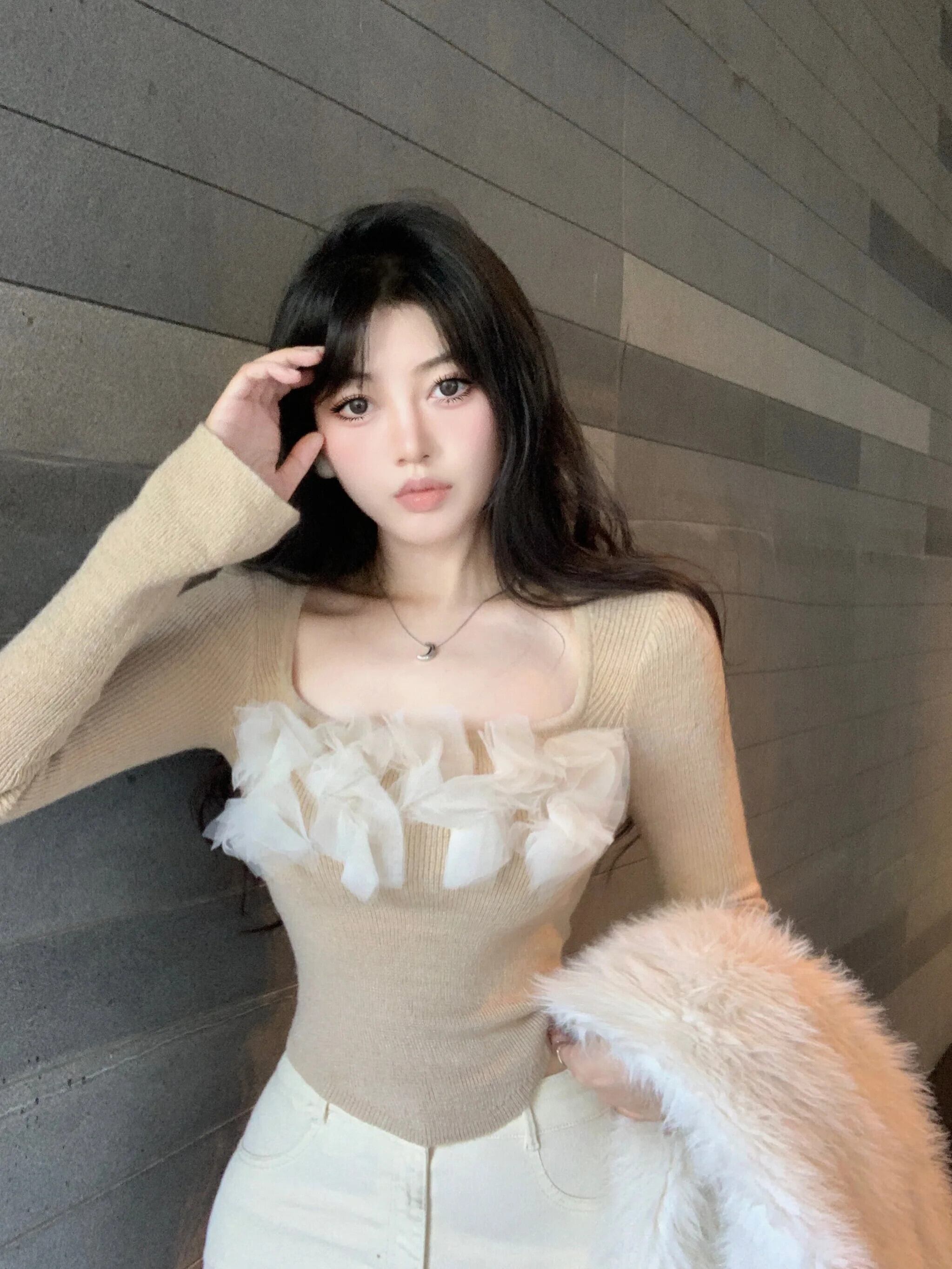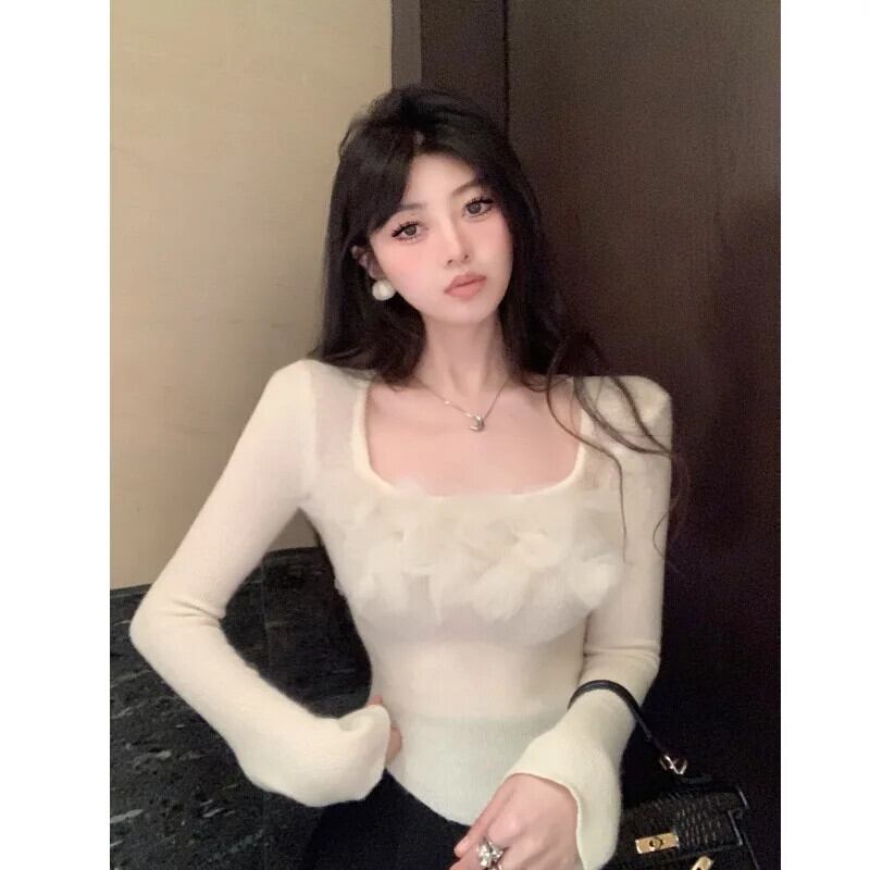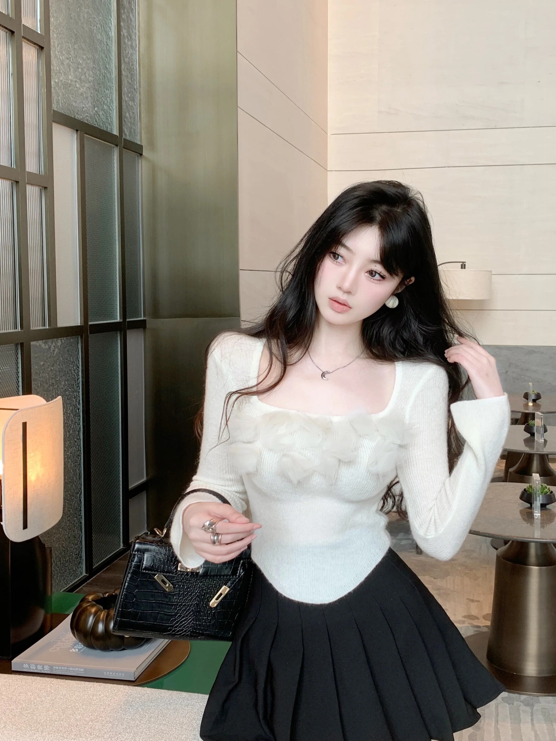 フレンチスウィートガールピュアセクシーフラワーセーター秋/冬スリムフィットスクエアカラーショートニットプルオーバー 大人ガーリー キュート カジュアル オータム 秋物 ウィンター 冬物 フラワーデザイン スクウェア