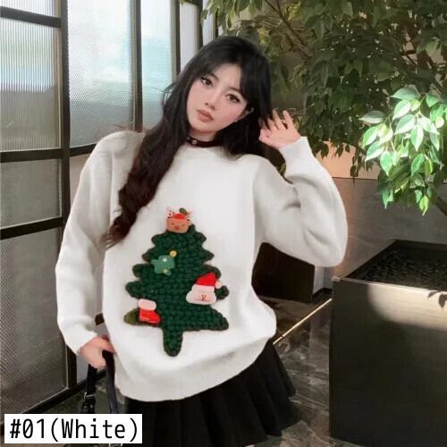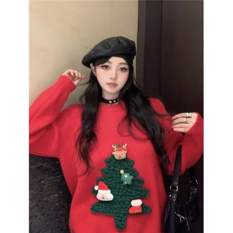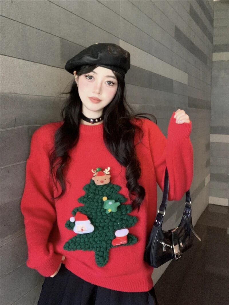 Sweet Girl クリスマスレッドセーター秋/冬長袖ルーズ O ネックシックニットプルオーバー ロング 大人ガーリー スウィート キュート カジュアル オータム 秋物 ウィンター 冬物 Oネック