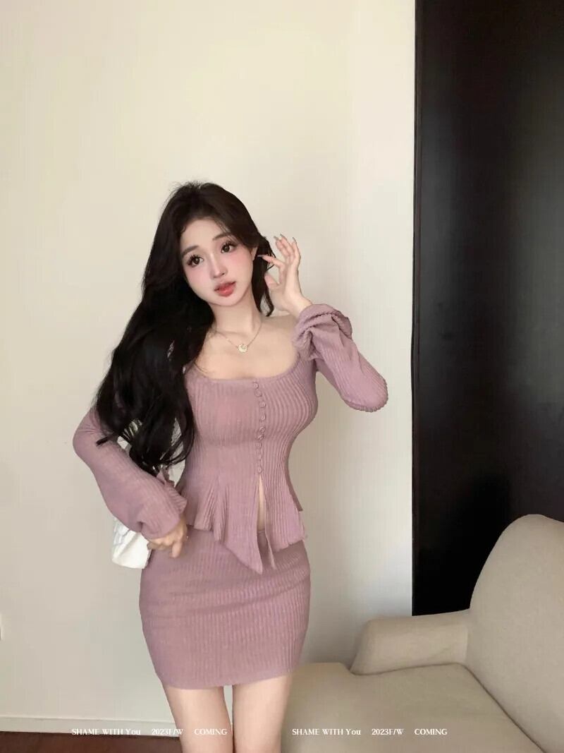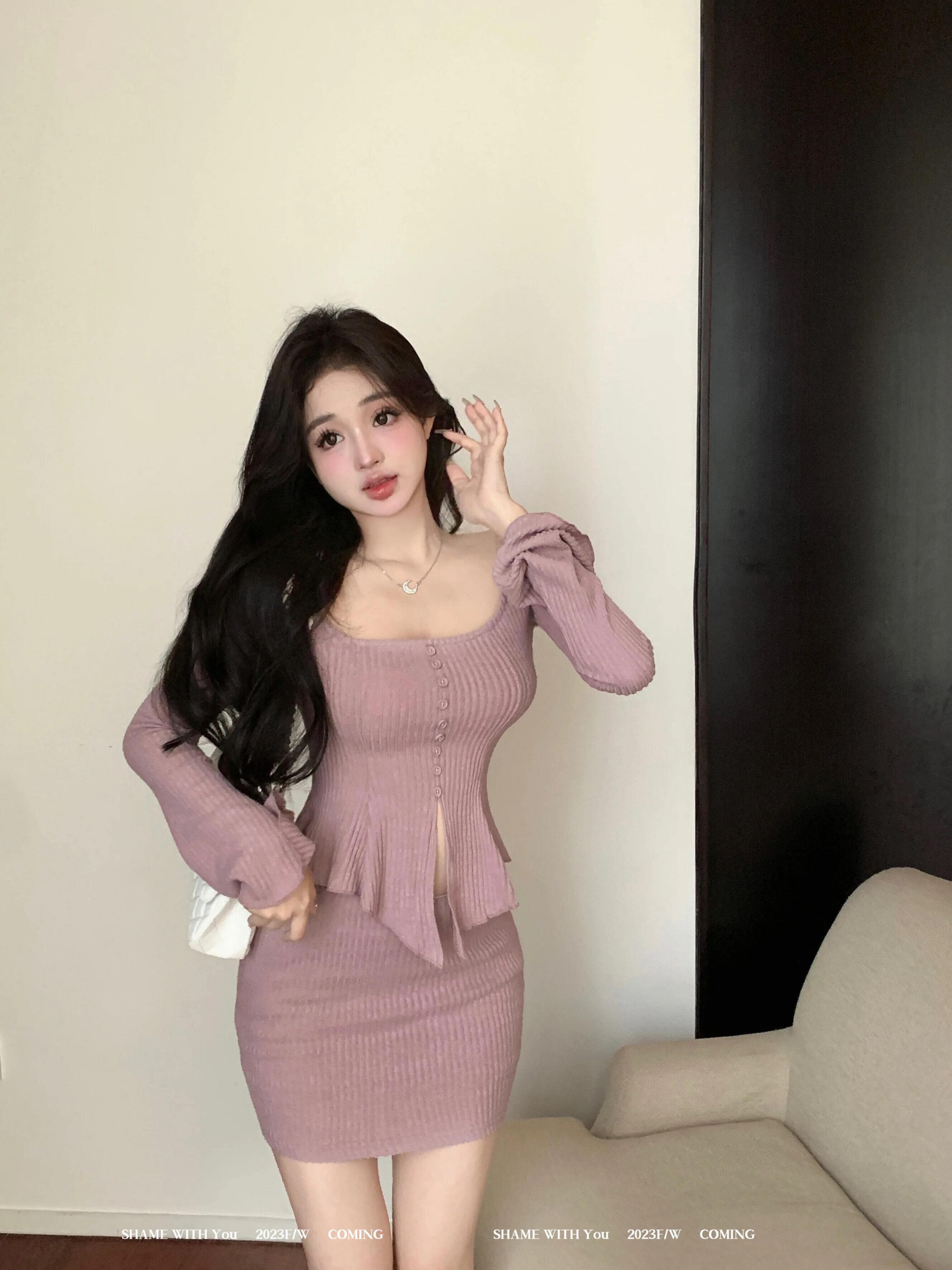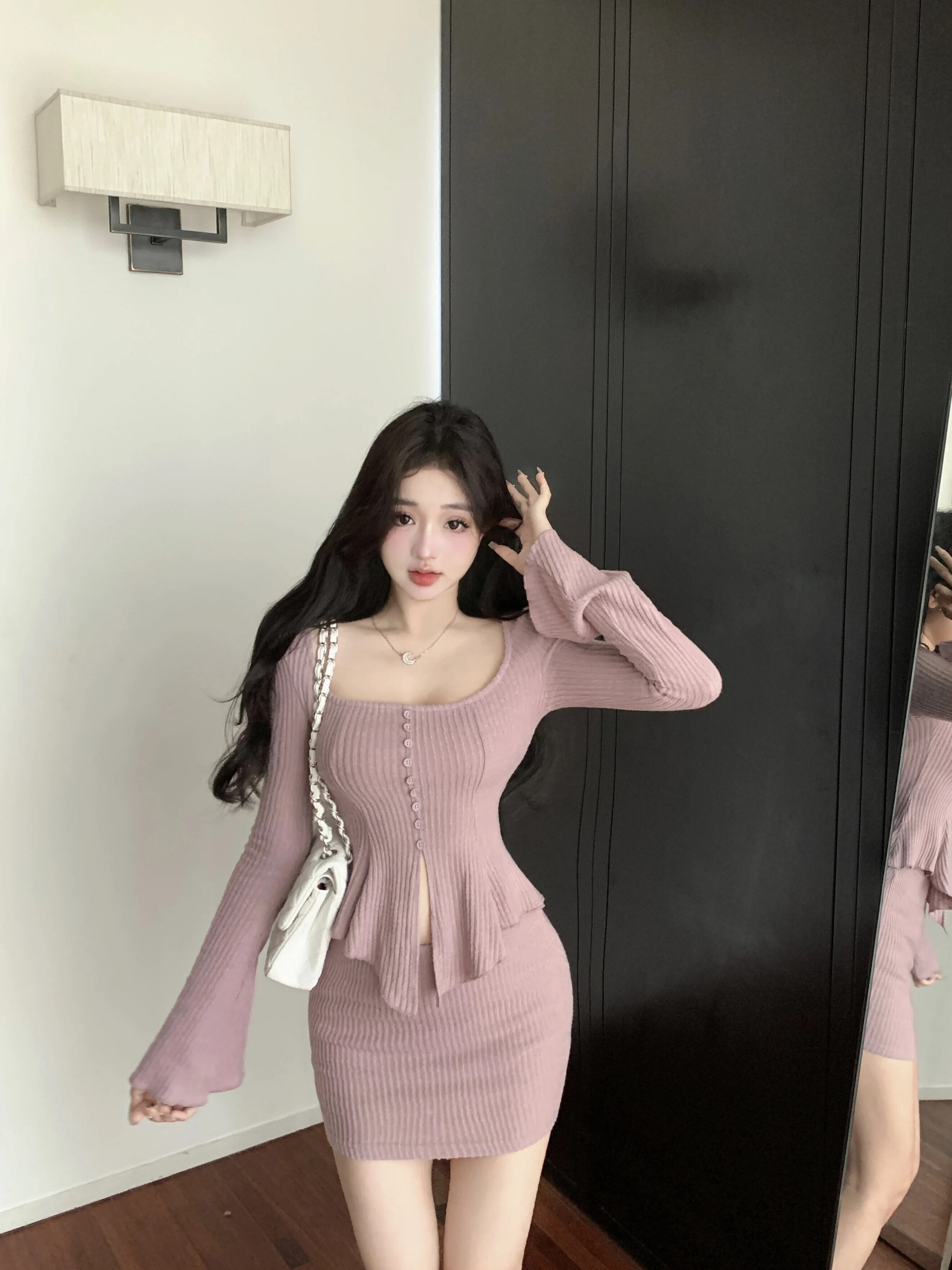 ホットガール純粋セクシーガール秋オフショルダー長袖ニットウエストミニスカートツーピースセット ロング オータム 秋物 ピュア