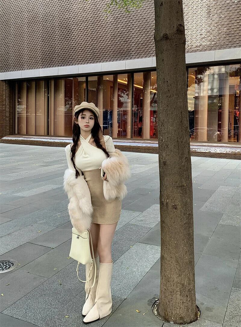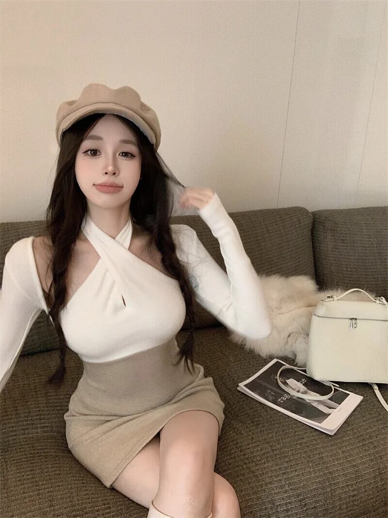 ホットガールホルターネッククロスストラップドレス秋と冬長袖スリムフィットラップヒップドレス ロング オータム 秋物 ウィンター 冬物