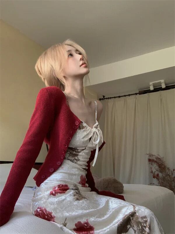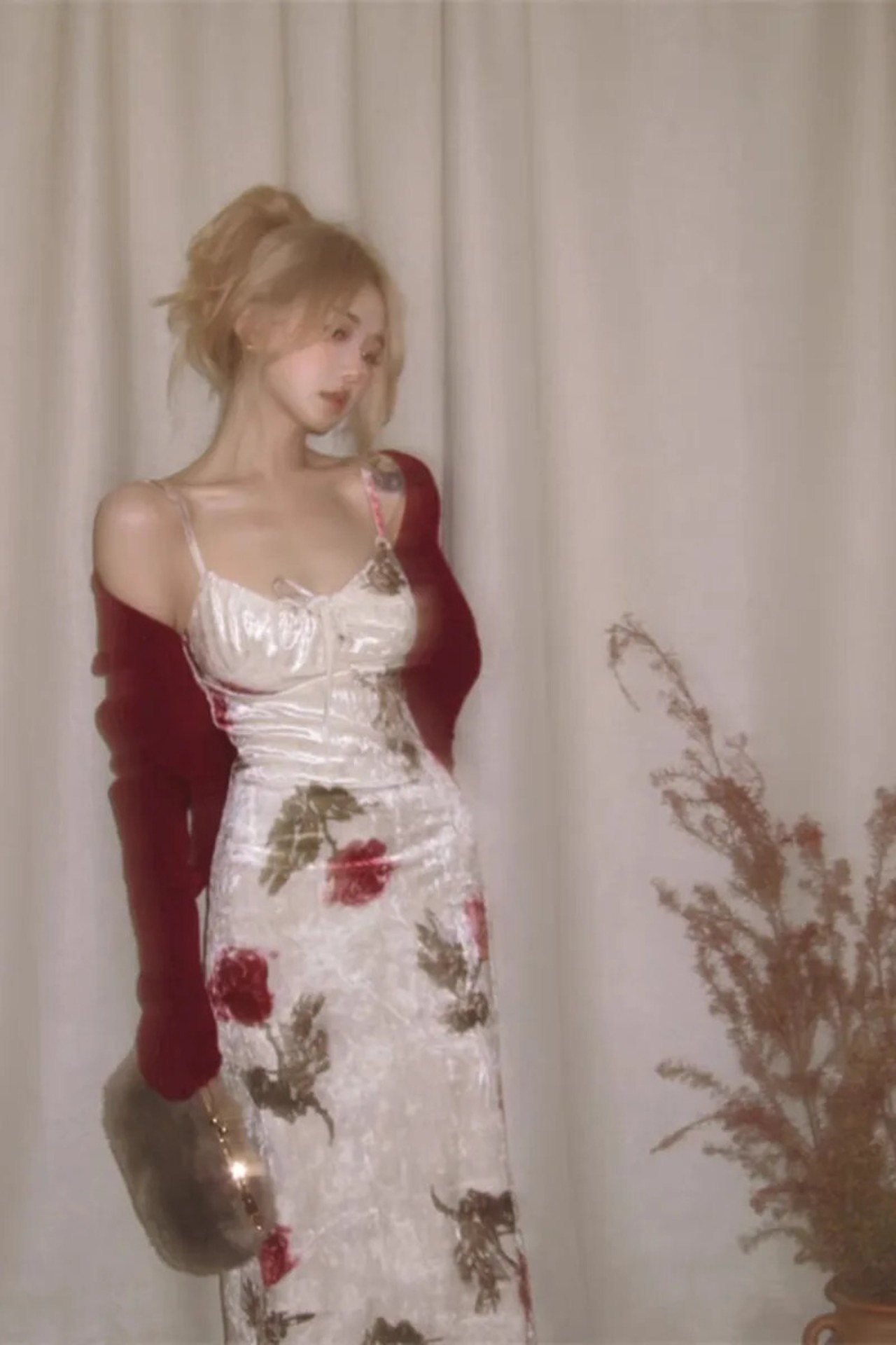 スウィートガールレトロスーツ秋マーメイドベルベットストラップドレススリムフィットニットカーディガンツーピースセット 大人ガーリー キュート カジュアル オータム 秋物