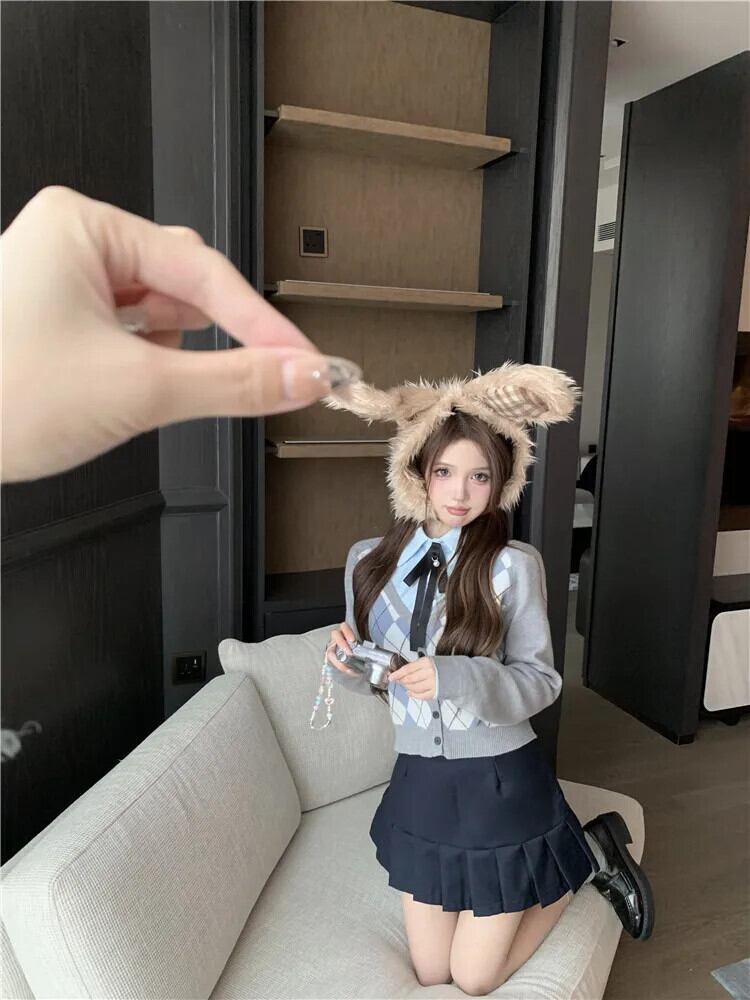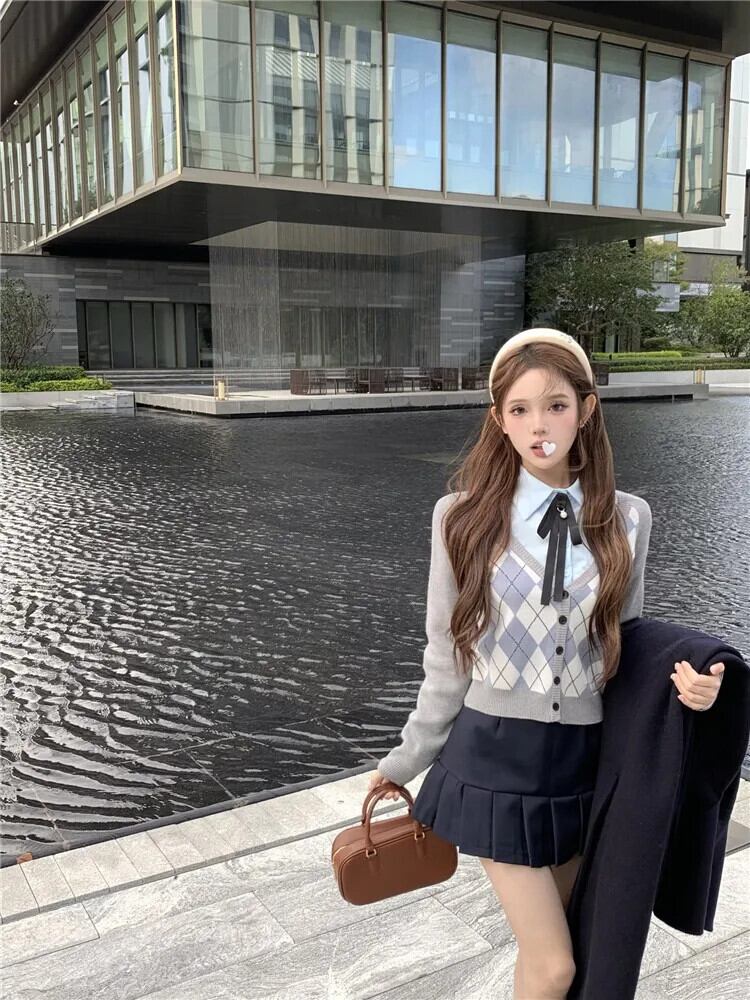 スイートガールスタイルスーツ レディース 秋冬 菱形格子セーター ブルーシャツ ミニプリーツスカート 3点セット 大人ガーリー スウィート キュート カジュアル オータム 秋物 ウィンター 冬物