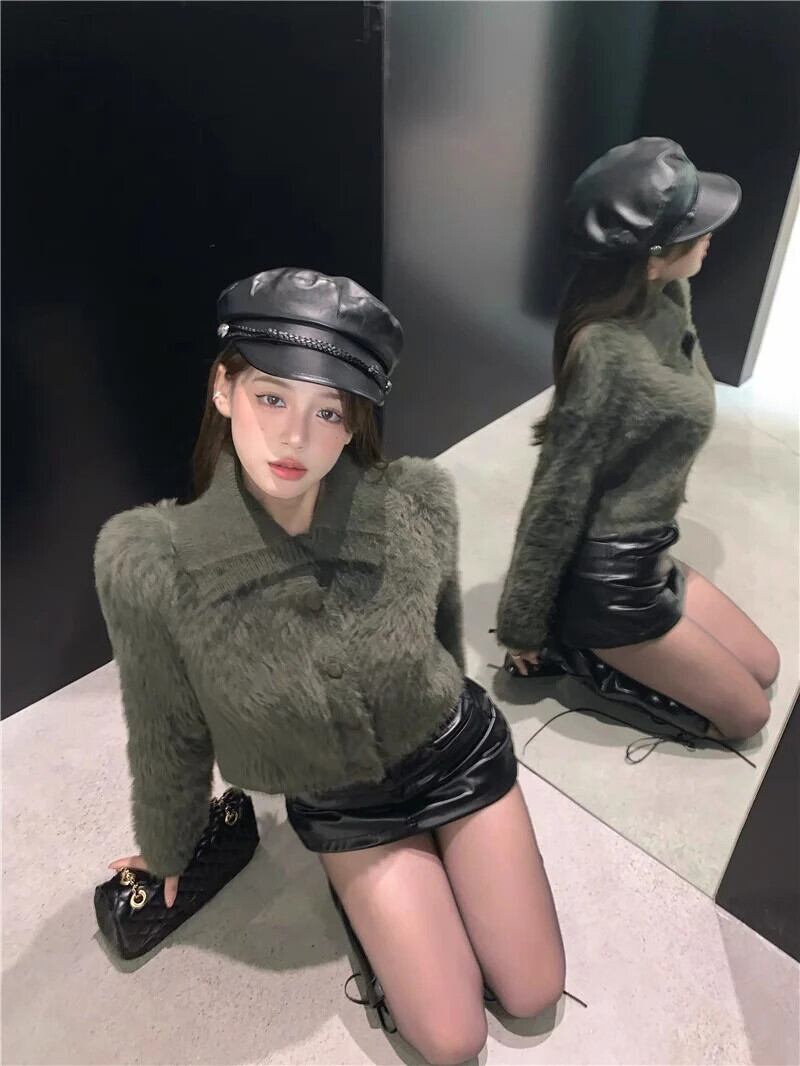 スウィートガールモヘアネックショートニットカーディガン秋/冬ルーズ長袖セーターコート ロング 大人ガーリー キュート カジュアル オータム 秋物 ウィンター 冬物