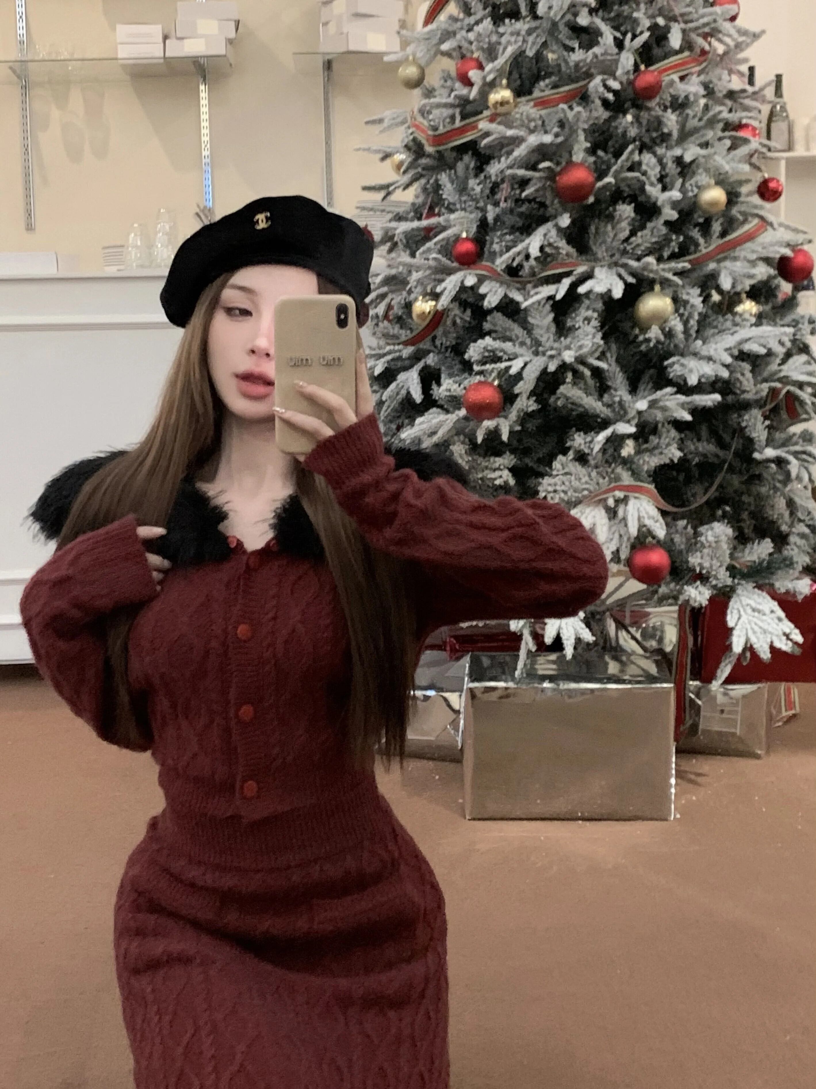 甘いホットガールスーツ冬ツイストショートニットカーディガンウエストヒップラップスカートツーピースセット 大人ガーリー スウィート キュート カジュアル ウィンター 冬物