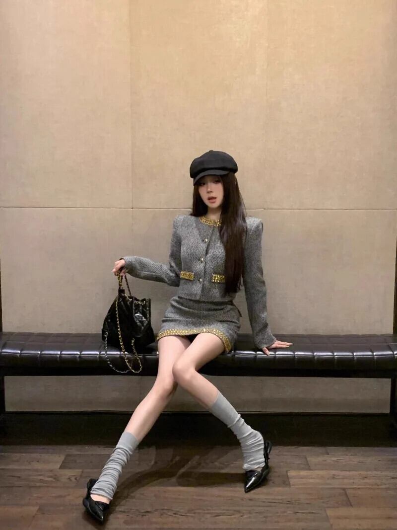 甘いホットガールスーツ冬 O ネック長袖ツイードコートラップヒップショートスカート 2 点セット ロング 大人ガーリー スウィート キュート カジュアル ウィンター 冬物 Oネック