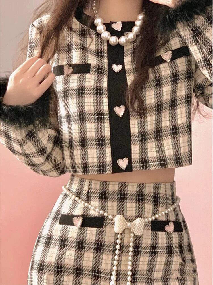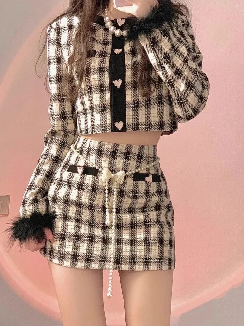 甘いホットガールスーツ秋 O ネックショートチェック柄コートトップラップヒップミニスカート 2 点セット 大人ガーリー スウィート キュート カジュアル オータム 秋物 Oネック