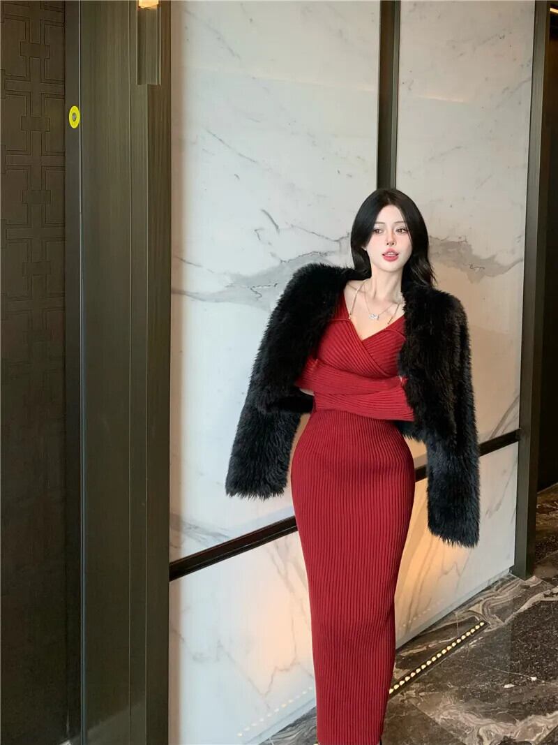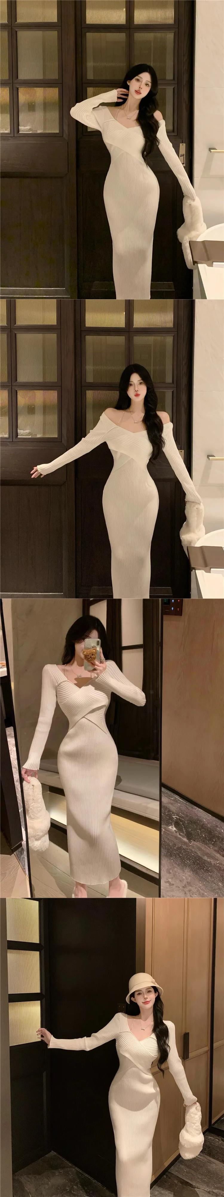 純粋セクシーホットガールラップヒップドレス秋スラッシュネック長袖ニット V ネックロングドレス オータム 秋物 Vネック