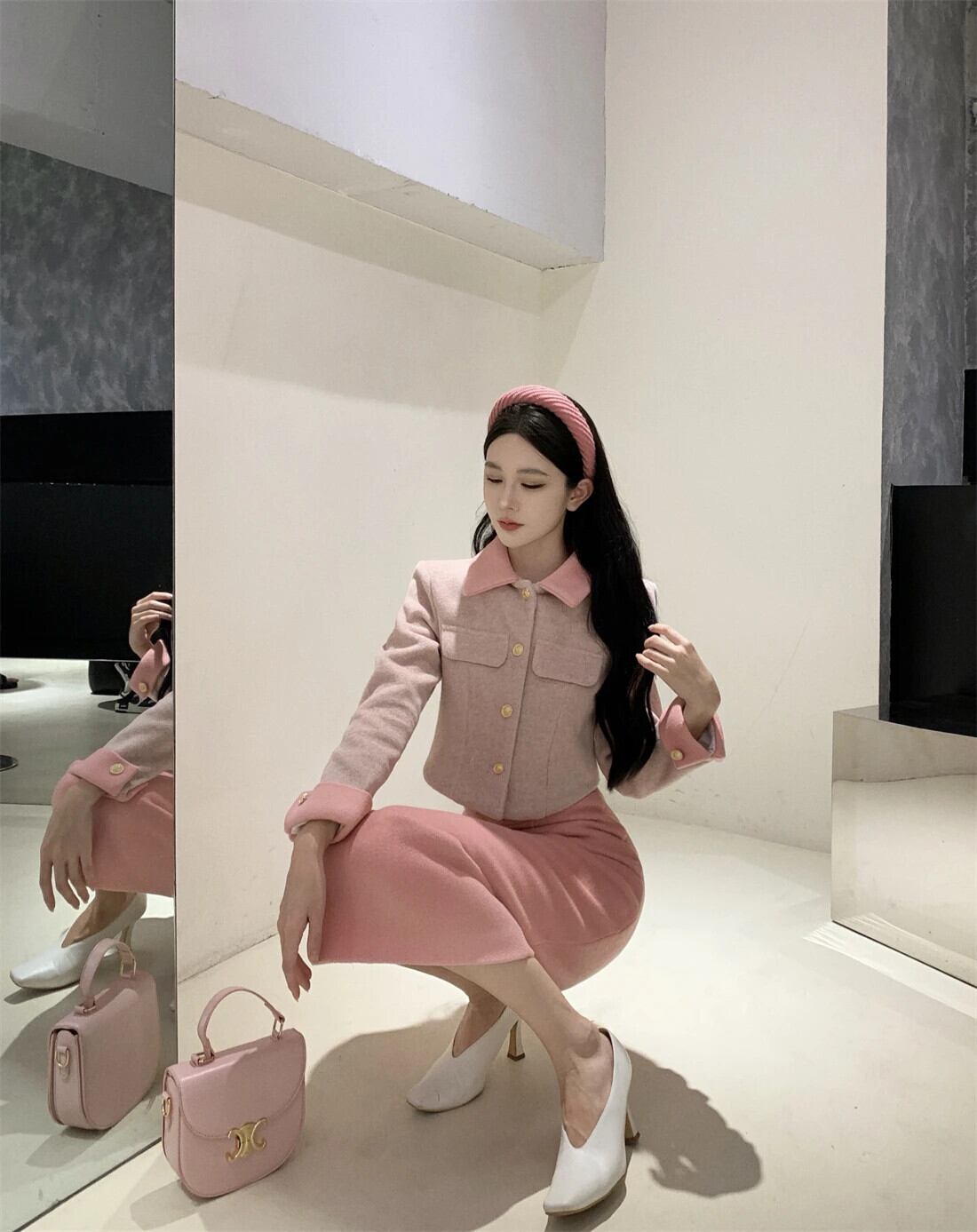 甘いホットガールスーツ冬ピンクターンダウン襟ウールコートウエストロングスカートツーピースセット 大人ガーリー スウィート キュート カジュアル ウィンター 冬物