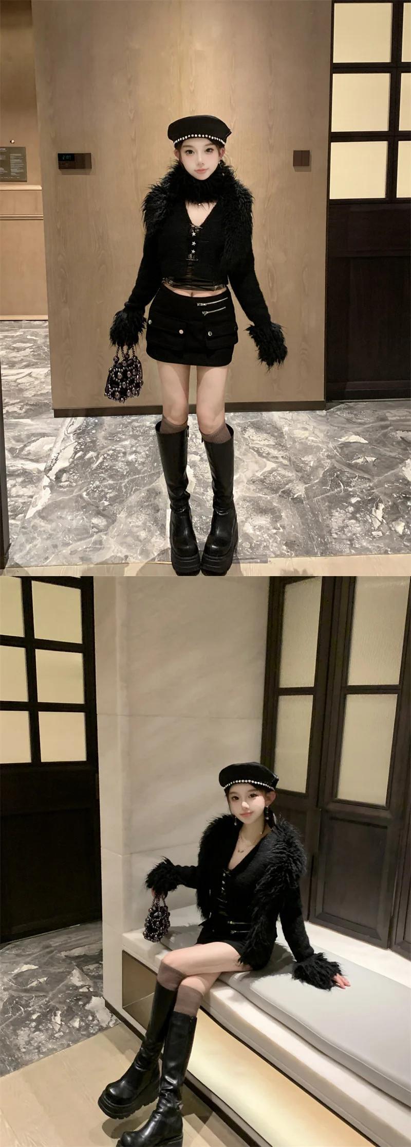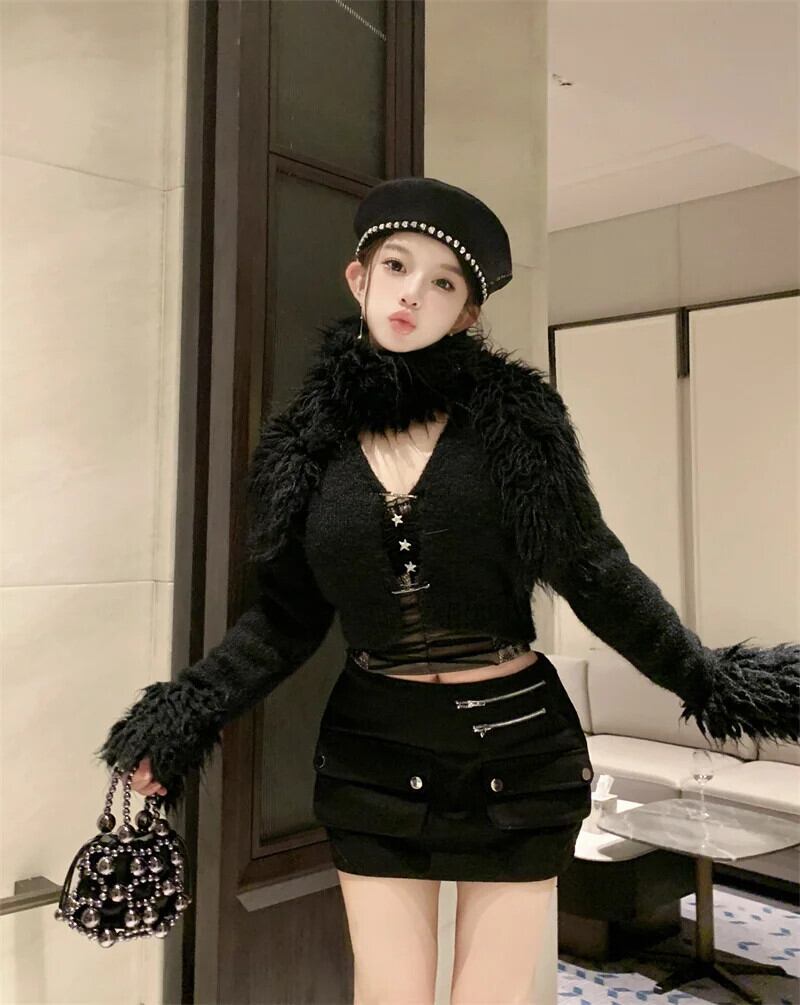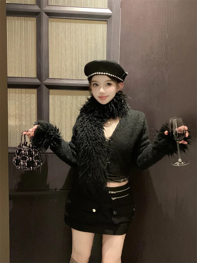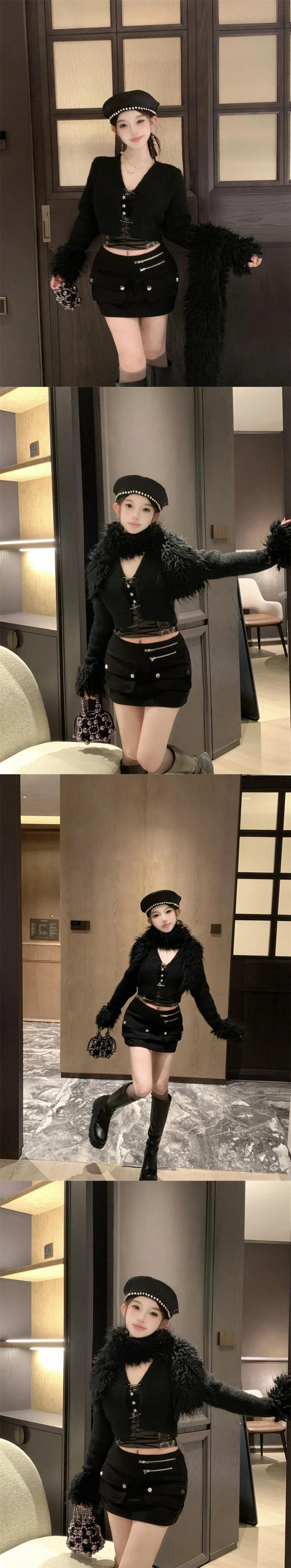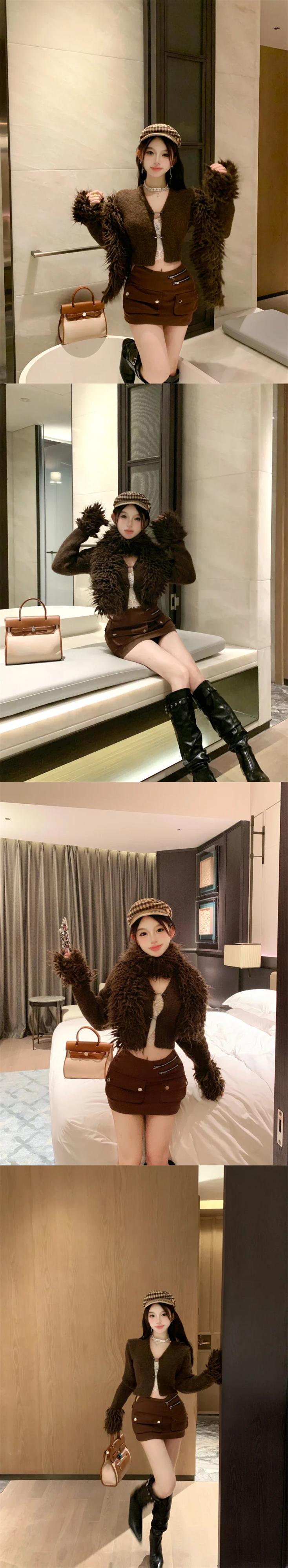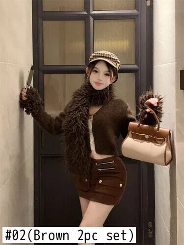 甘いホットガールスーツ秋/冬スプライシングスリムフィットニットカーディガンウエストミニスカートツーピースセット 大人ガーリー スウィート キュート カジュアル オータム 秋物 ウィンター 冬物