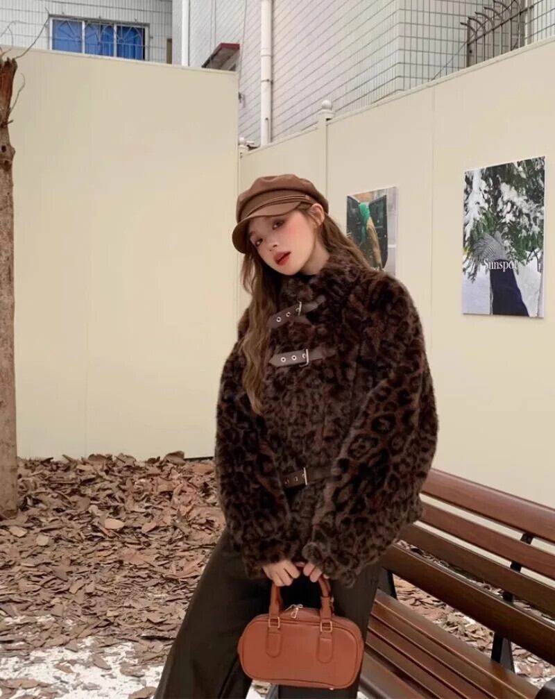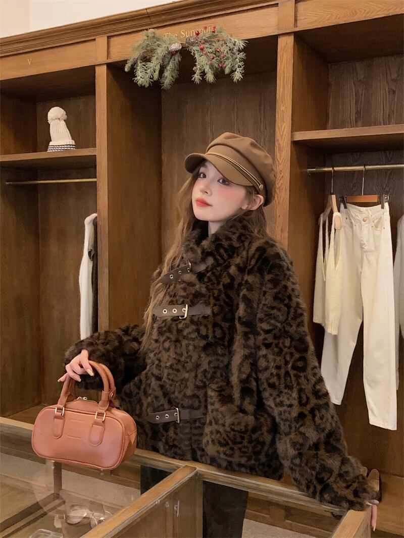 甘いホットガールヒョウ柄毛皮コート冬スタンドカラールーズ長袖ジャケット ロング 大人ガーリー スウィート キュート カジュアル ウィンター 冬物