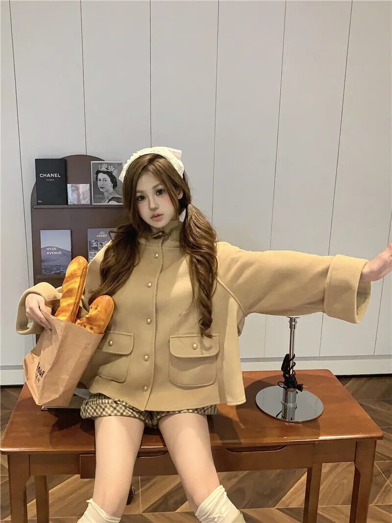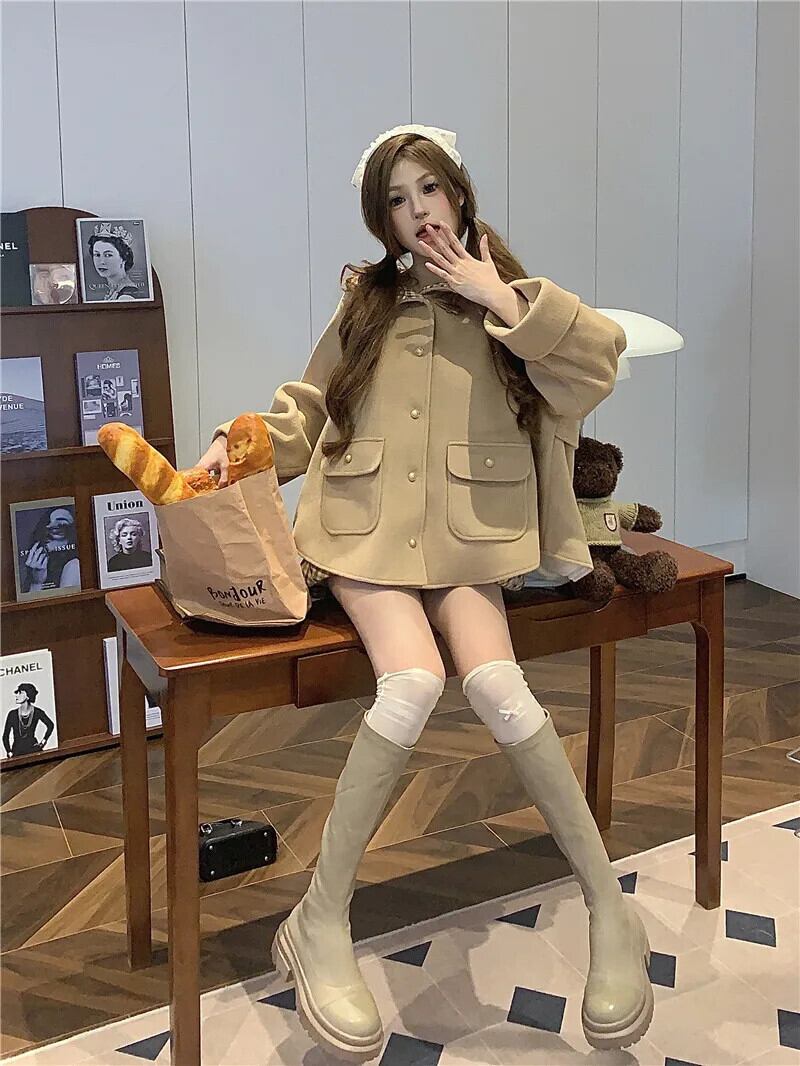 スイートガールスーツ秋カーキチェック柄パッチワークフード付きウールケープコートウエストショーツツーピースセット 大人ガーリー スウィート キュート カジュアル オータム 秋物 ブルマー
