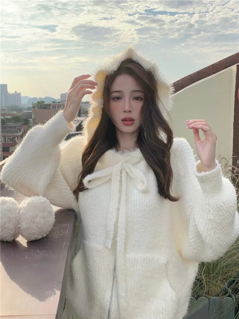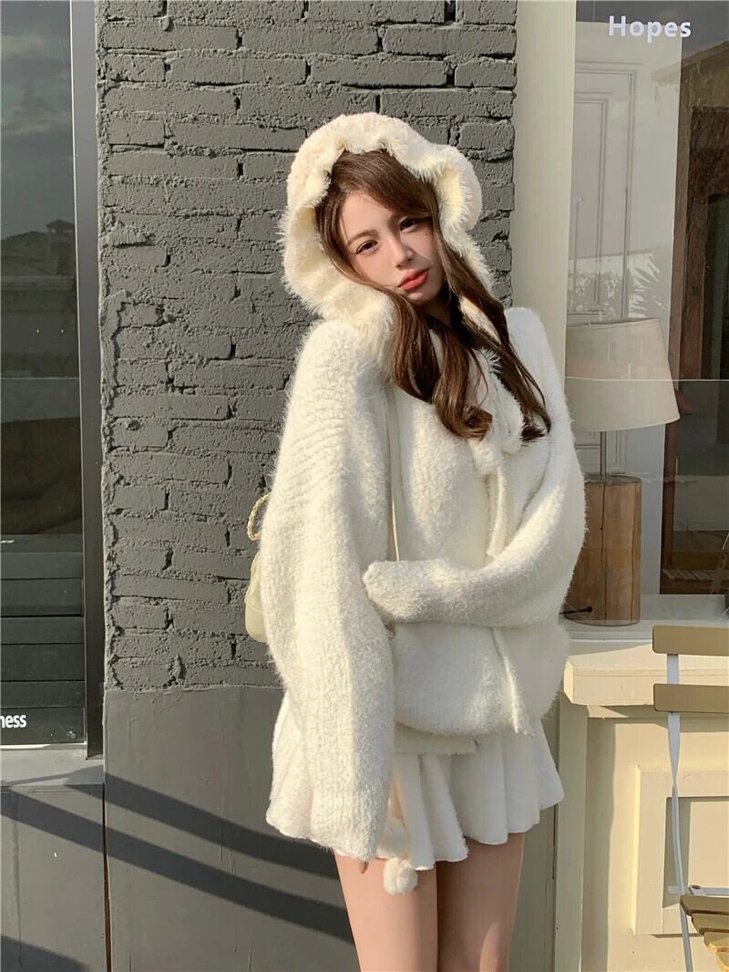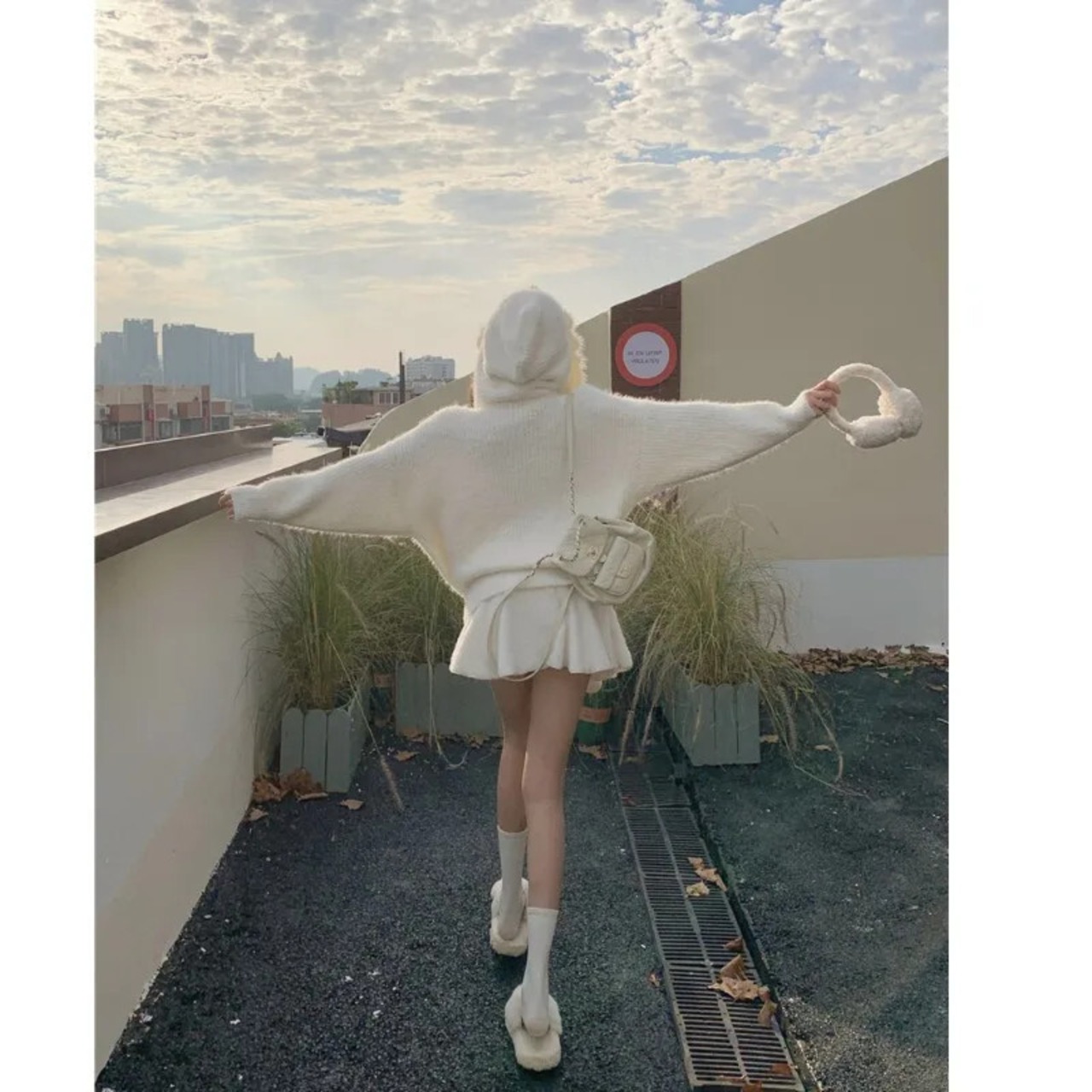 スイートガールスーツ レディース 秋 ルーズ フード付き ニット カーディガン ウエスト Aライン ミニスカート ツーピースセット 大人ガーリー スウィート キュート カジュアル オータム 秋物