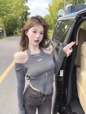 ホットガールホルターネックオフショルダーニット秋と冬不規則 Perated グレーセーター オータム 秋物 ウィンター 冬物
