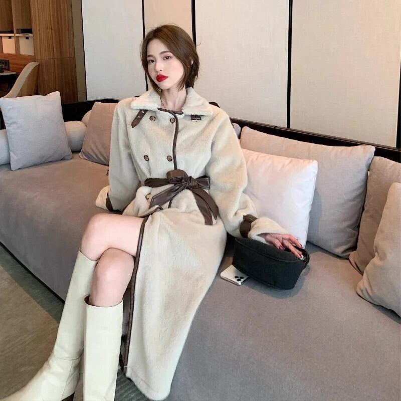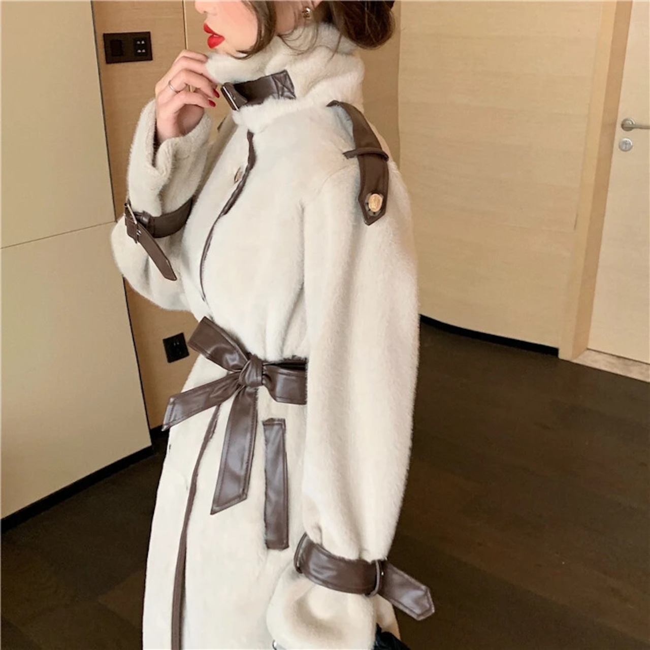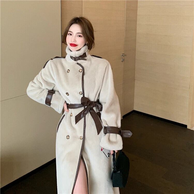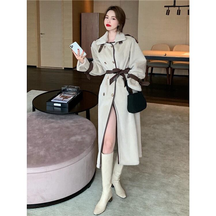 フレンチスイートホットガールスタンドカラーウールコート冬ルーズダブルブレストレースアップロングコート 大人ガーリー スウィート キュート カジュアル ウィンター 冬物