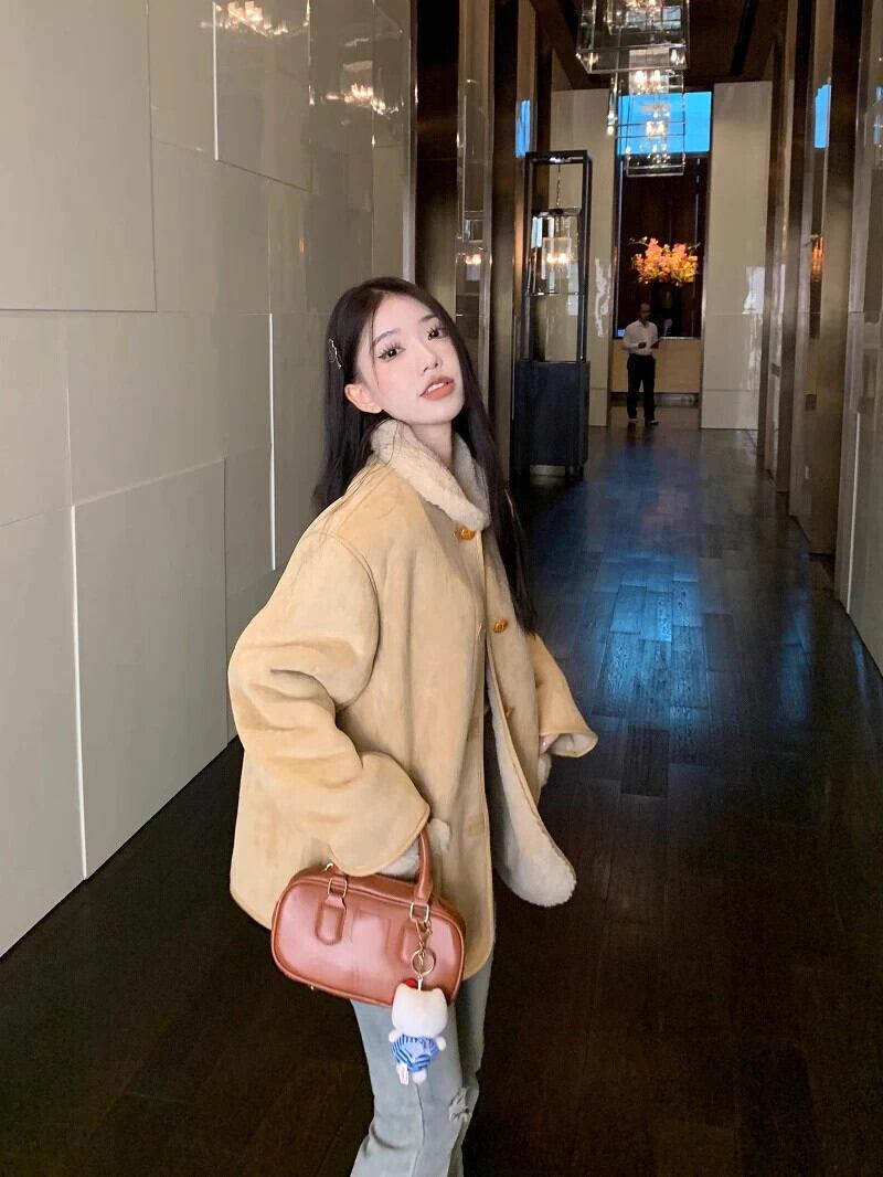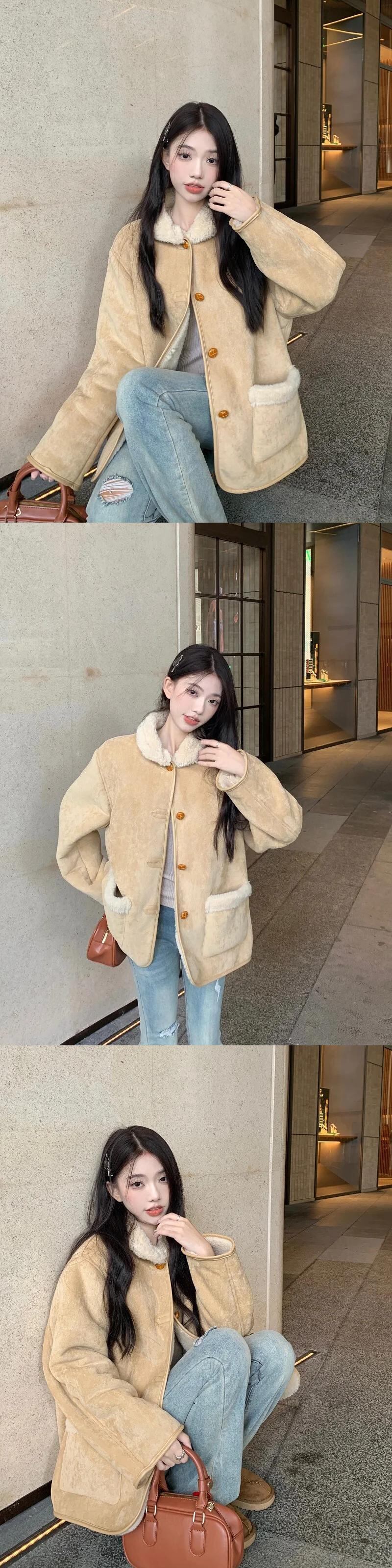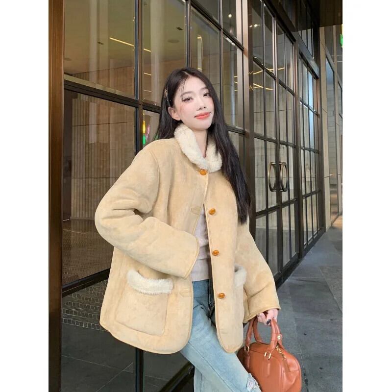 甘いホットガールラペルカーキジャケット秋と冬暖かいルーズフィット両面毛皮コートトップ 大人ガーリー スウィート キュート カジュアル オータム 秋物 ウィンター 冬物