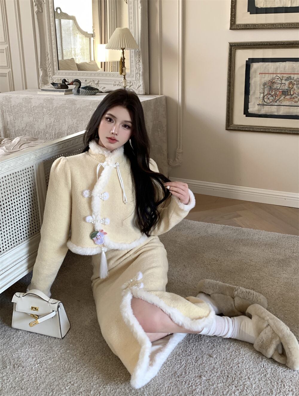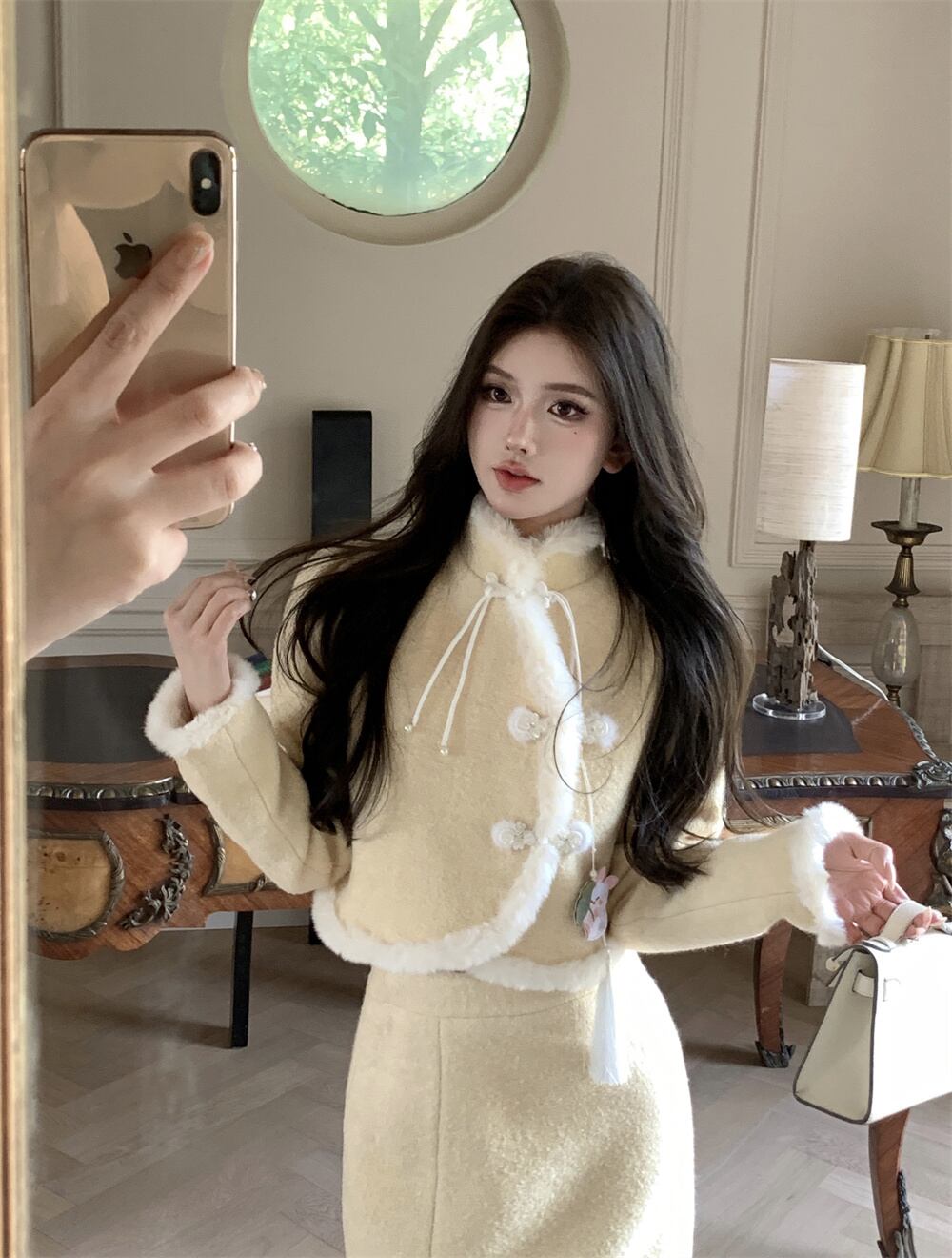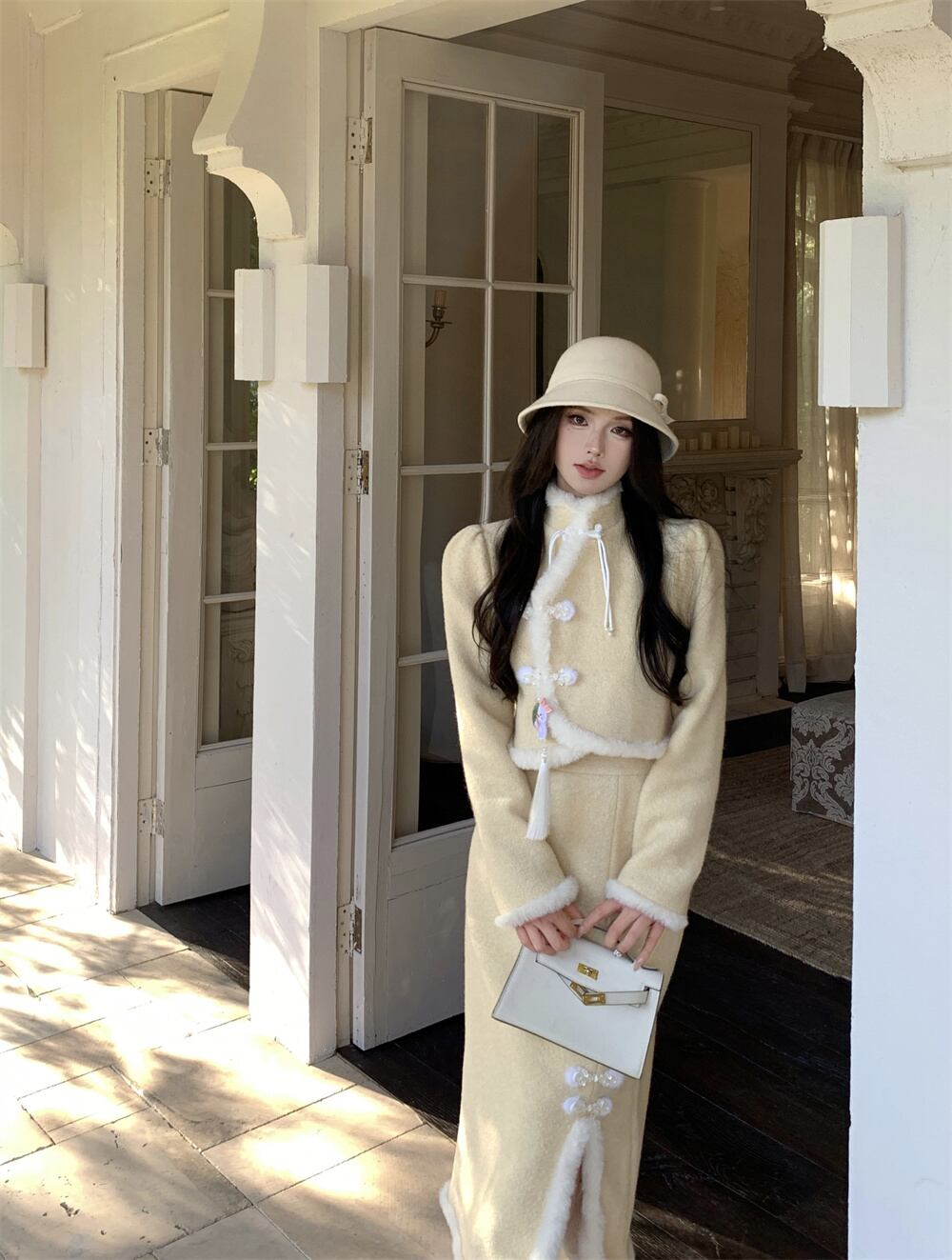 スイートガールスーツ秋/冬豪華スプライシングスタンドカラーウールコートウエストラップヒップスカートツーピースセット 大人ガーリー スウィート キュート カジュアル オータム 秋物 ウィンター 冬物