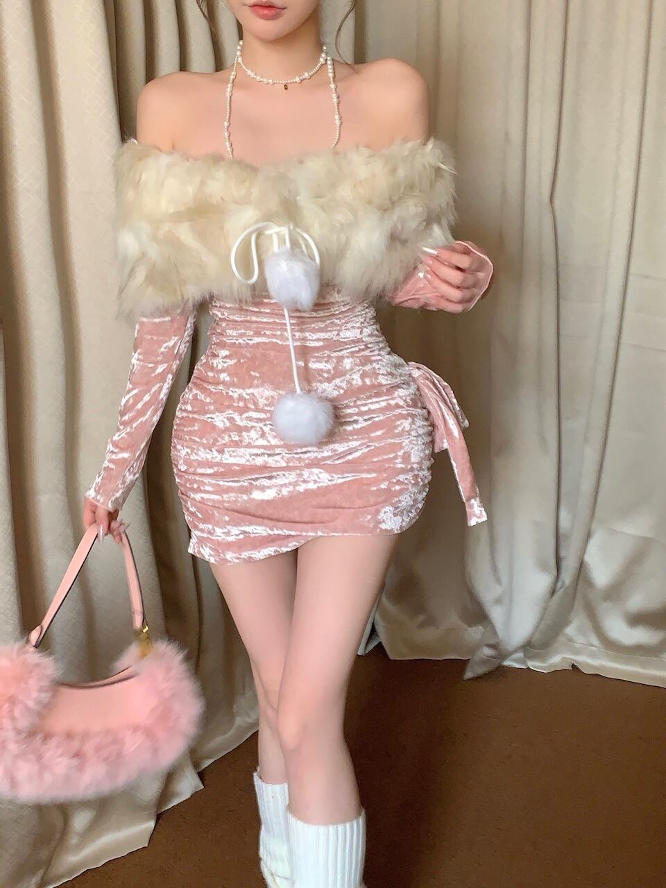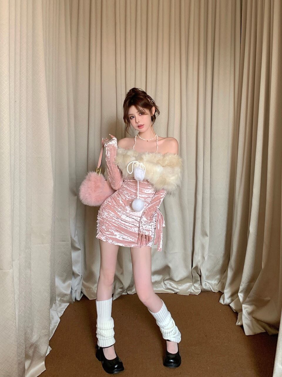 甘いホットガール純粋セクシー豪華オフショルダードレス冬スリムフィットベルベットラップヒップショートドレス 大人ガーリー スウィート キュート カジュアル ウィンター 冬物 ピュア