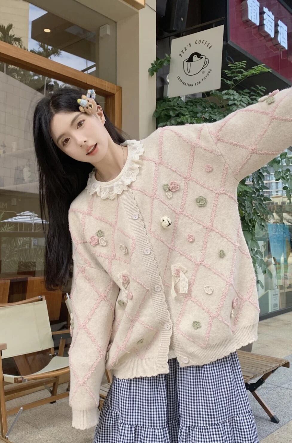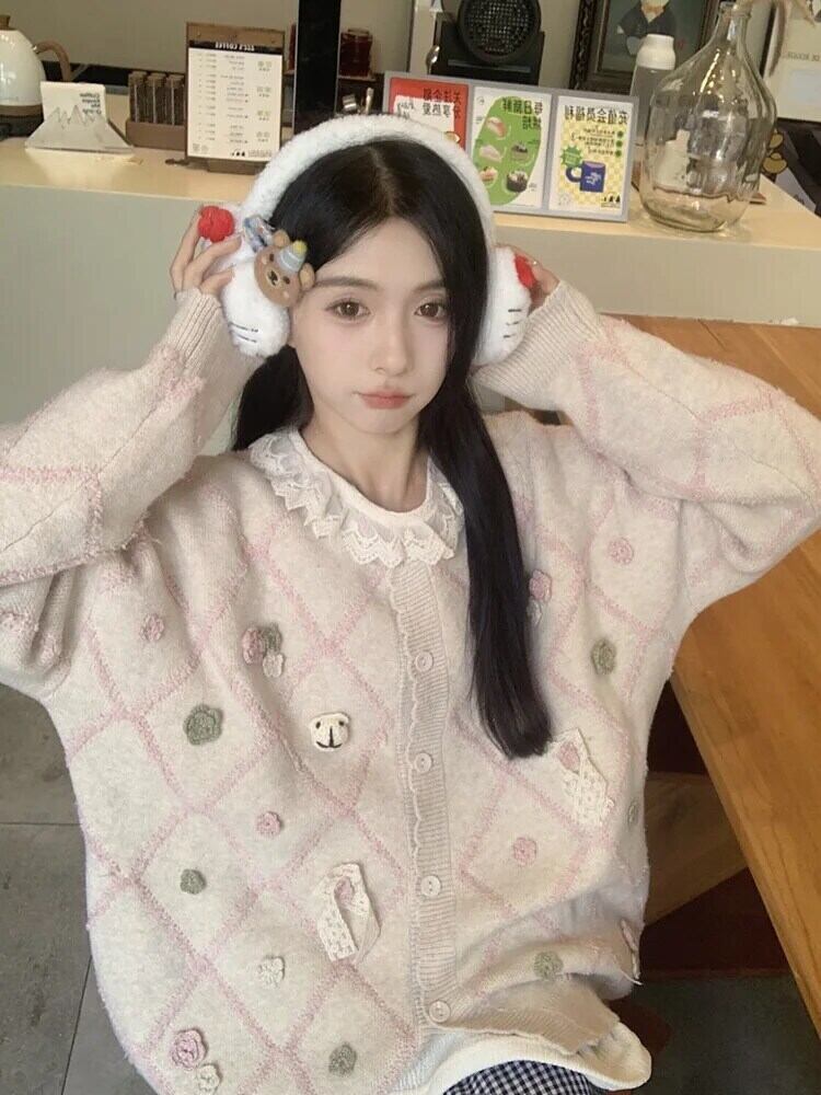 甘いホットガール 3D フラワーニットカーディガン冬 O ネックレースルーズ長袖セーターコート ロング 大人ガーリー スウィート キュート カジュアル ウィンター 冬物 Oネック フラワーデザイン
