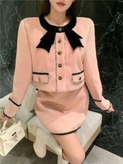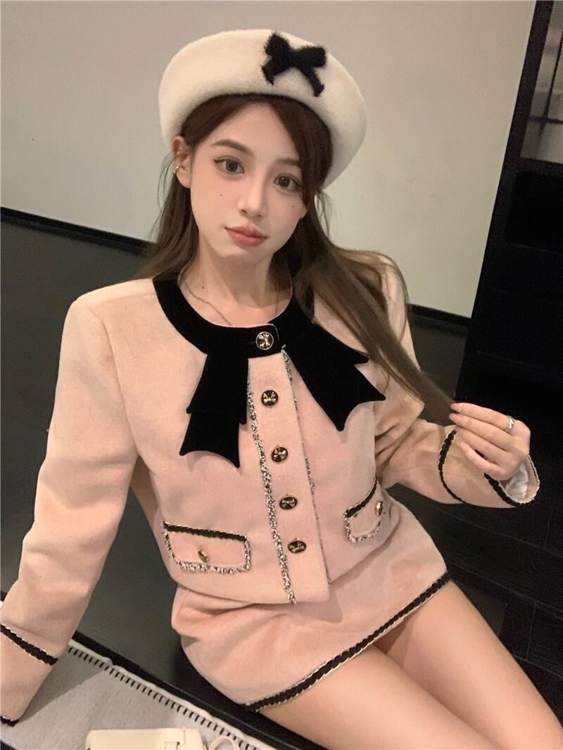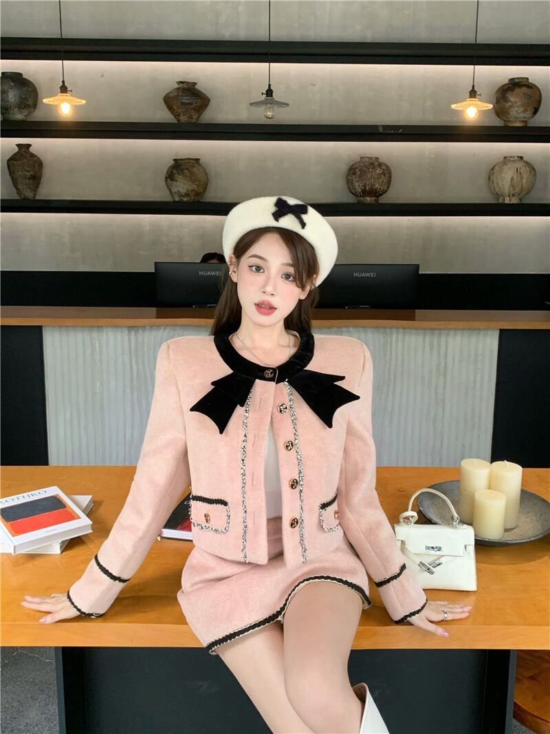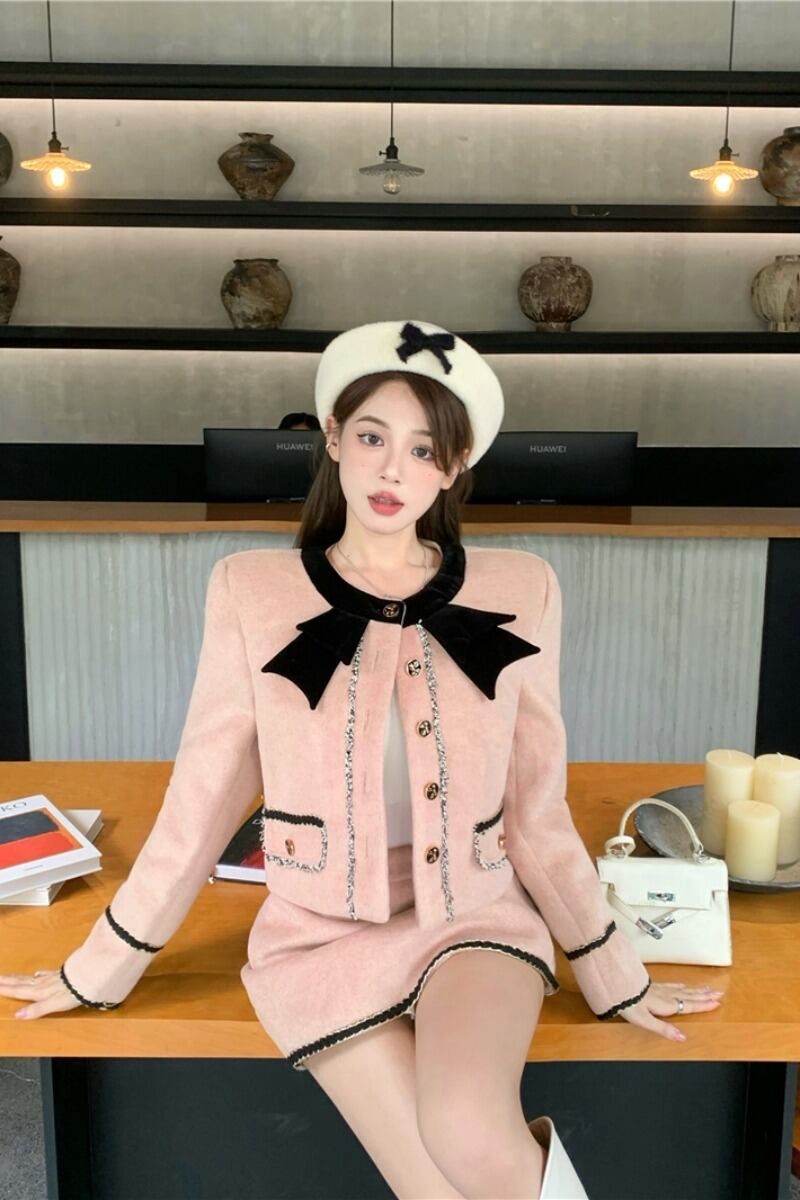 Sweet Girl ピンクスーツ秋/冬 O ネック長袖ショートコートラップヒップミニスカート 2 点セット ロング 大人ガーリー スウィート キュート カジュアル オータム 秋物 ウィンター 冬物 Oネック