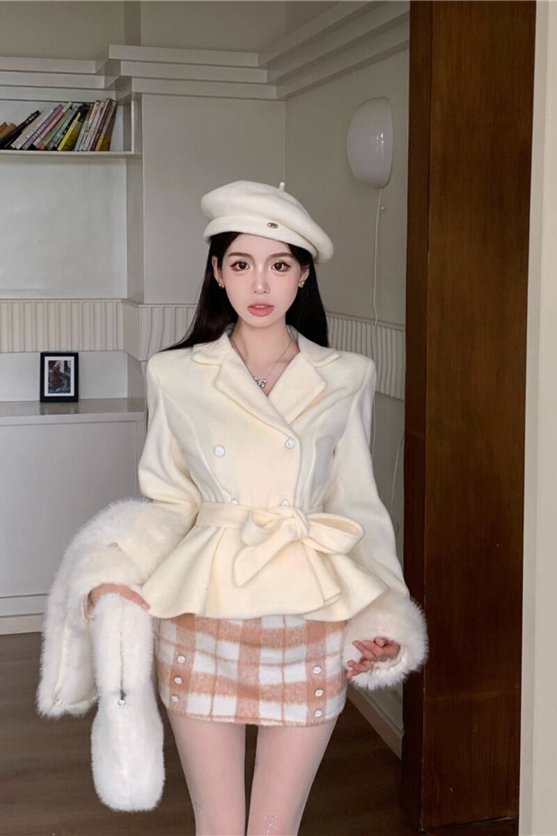 甘いホットガールスーツ冬毛皮襟パッチワークウールジャケットチェック柄ラップヒップスカートツーピースセット 大人ガーリー スウィート キュート カジュアル ウィンター 冬物