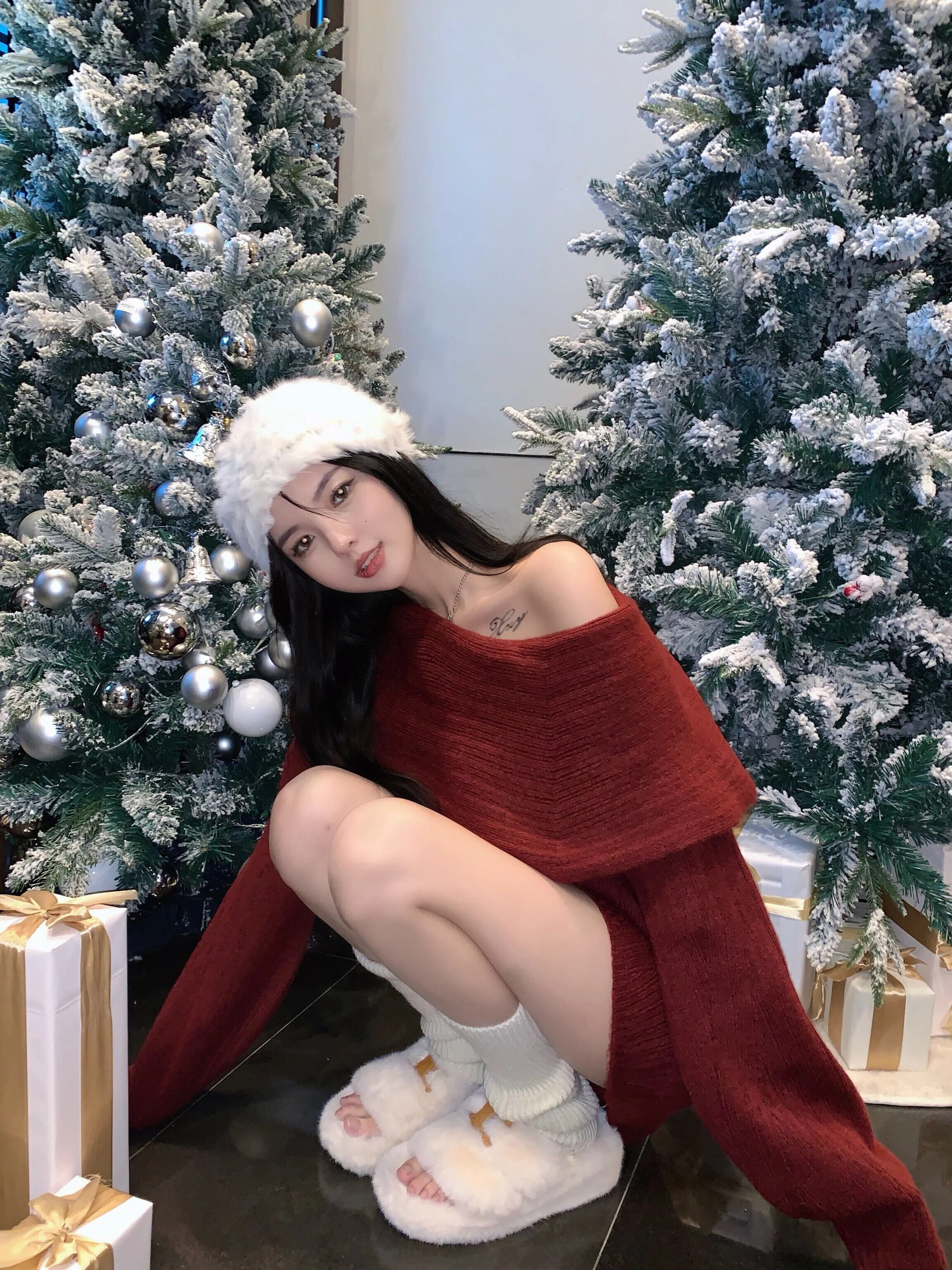 ホットガールクリスマスレッドオフショルダーセーター秋/冬ミッドレングススラッシュネックニットプルオーバー オータム 秋物 ウィンター 冬物