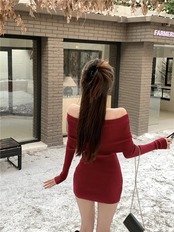 甘いホットガールレトロセクシーオフショルダーニットドレス冬弾性スリムフィットラップヒップショートドレス エラスティック 伸縮 大人ガーリー スウィート キュート カジュアル ウィンター 冬物