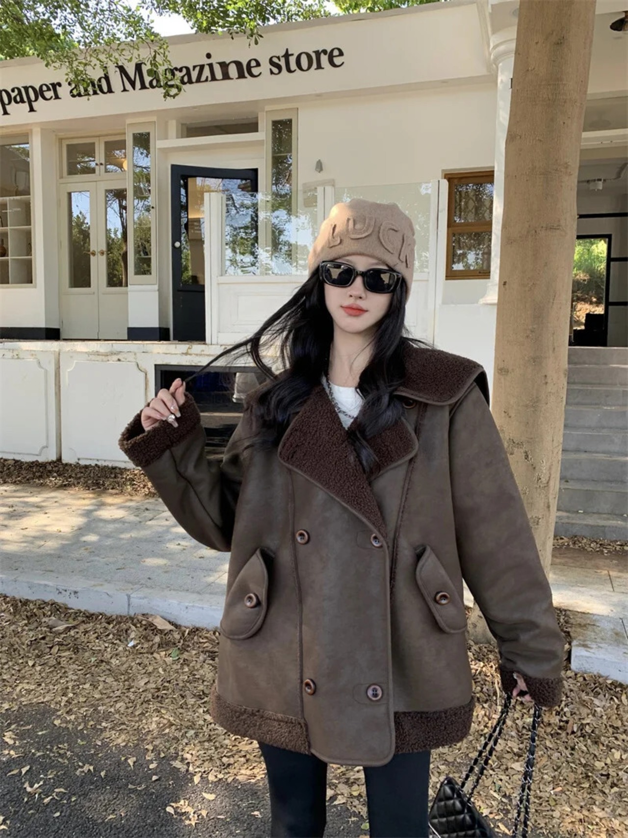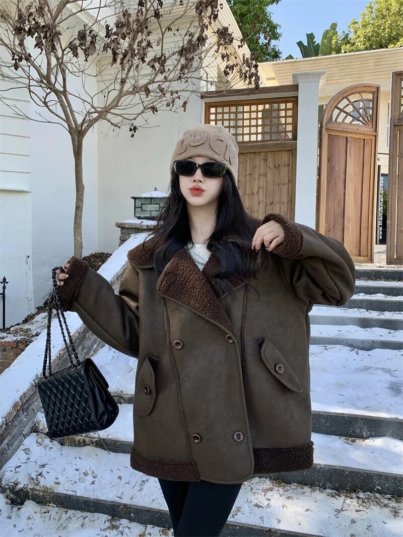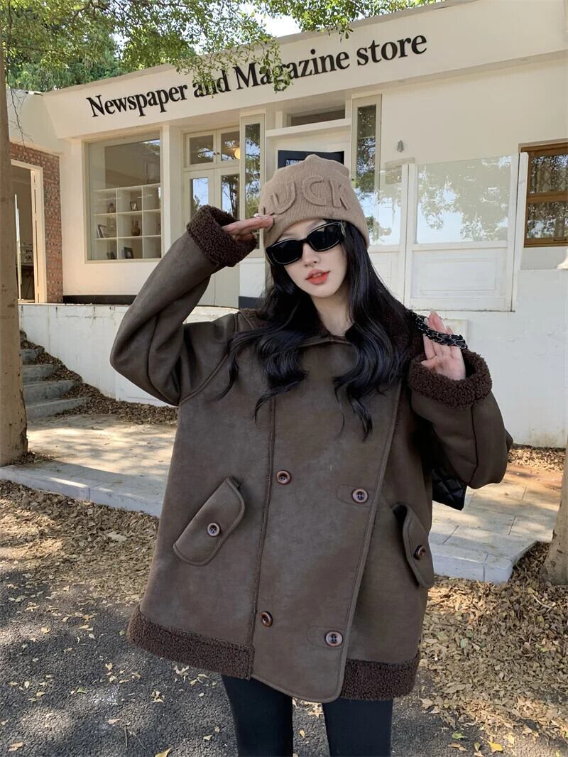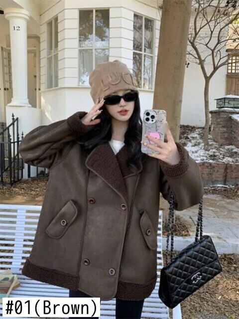 甘いホットガールブラウンラペルジャケット冬ミッドレングスルーズフィット暖かいダブルブレストコート 大人ガーリー スウィート キュート カジュアル ウィンター 冬物