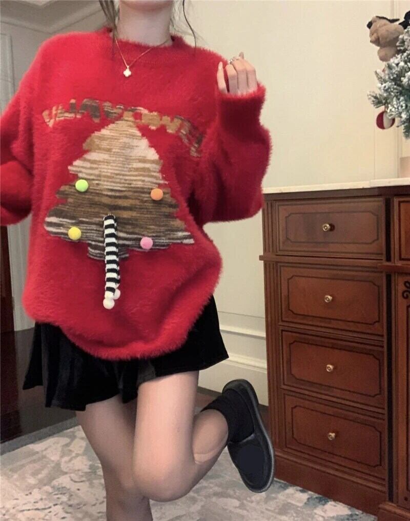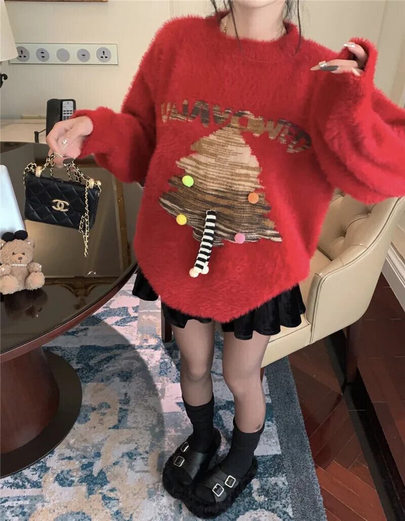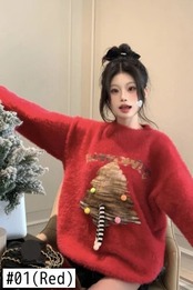 Sweet Girl グラデーションクリスマスレッドセーター秋/冬長袖 O ネックルーズプルオーバートップ ロング 大人ガーリー スウィート キュート カジュアル オータム 秋物 ウィンター 冬物 Oネック