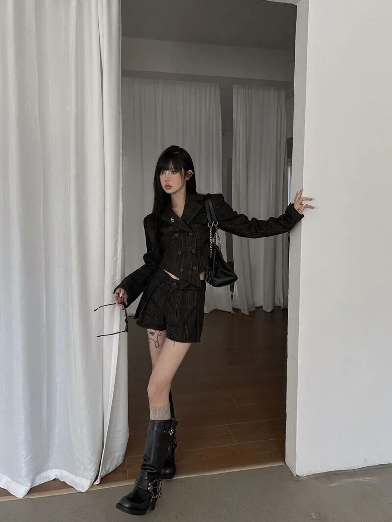 プレッピースタイルパターンスーツスリムフィット長袖コートプリーツローウエストズボンスカートツーピースセット ロング