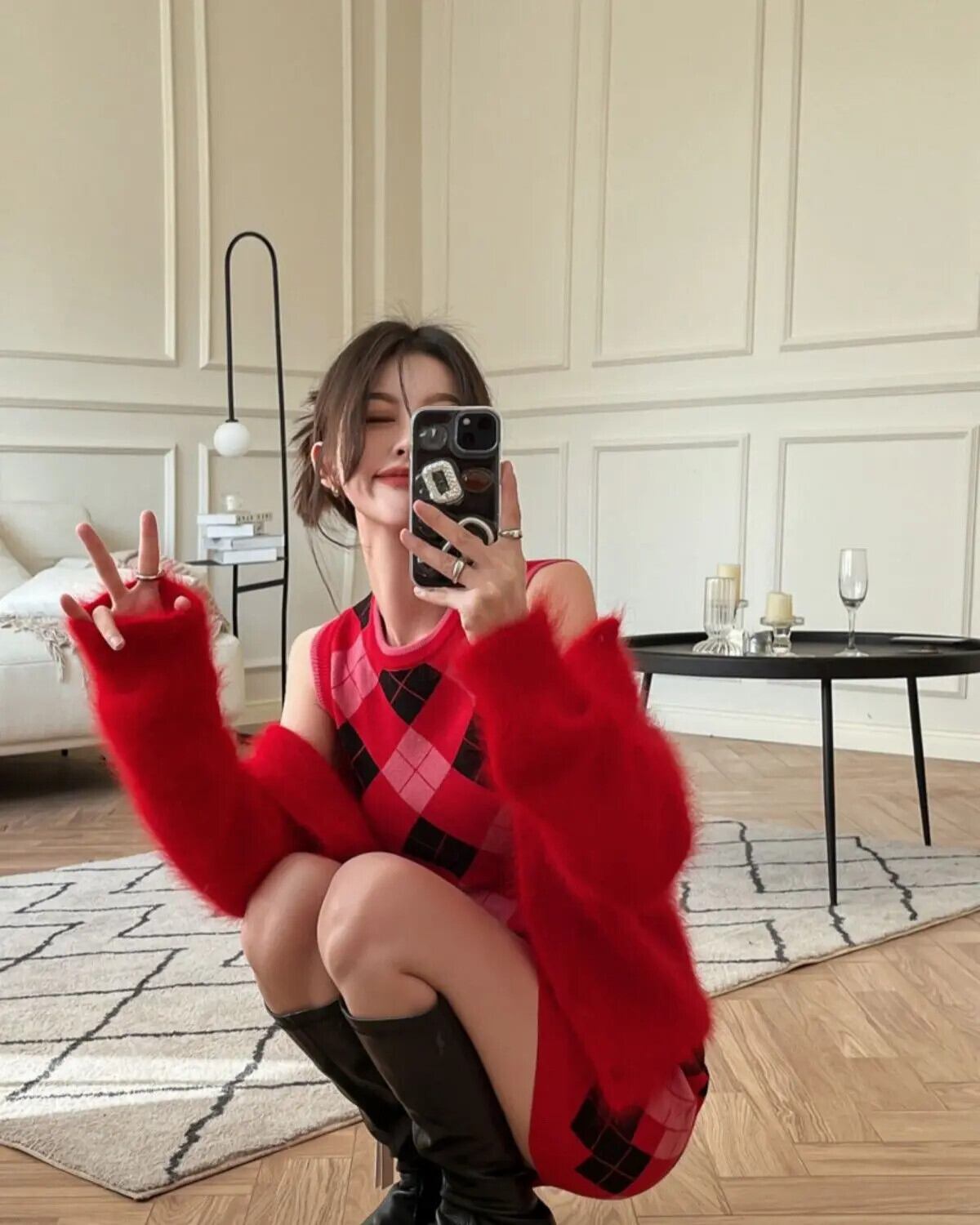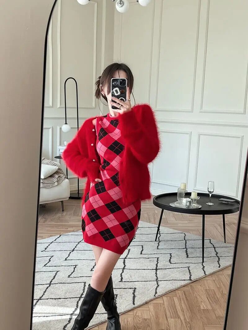 スイートガールスーツ春スリムフィット菱形格子ノースリーブドレス赤ニットカーディガン 2 点セット レッド 大人ガーリー スウィート キュート カジュアル スプリング 春物