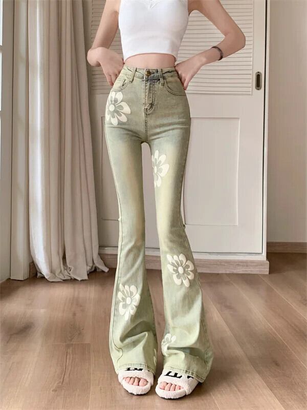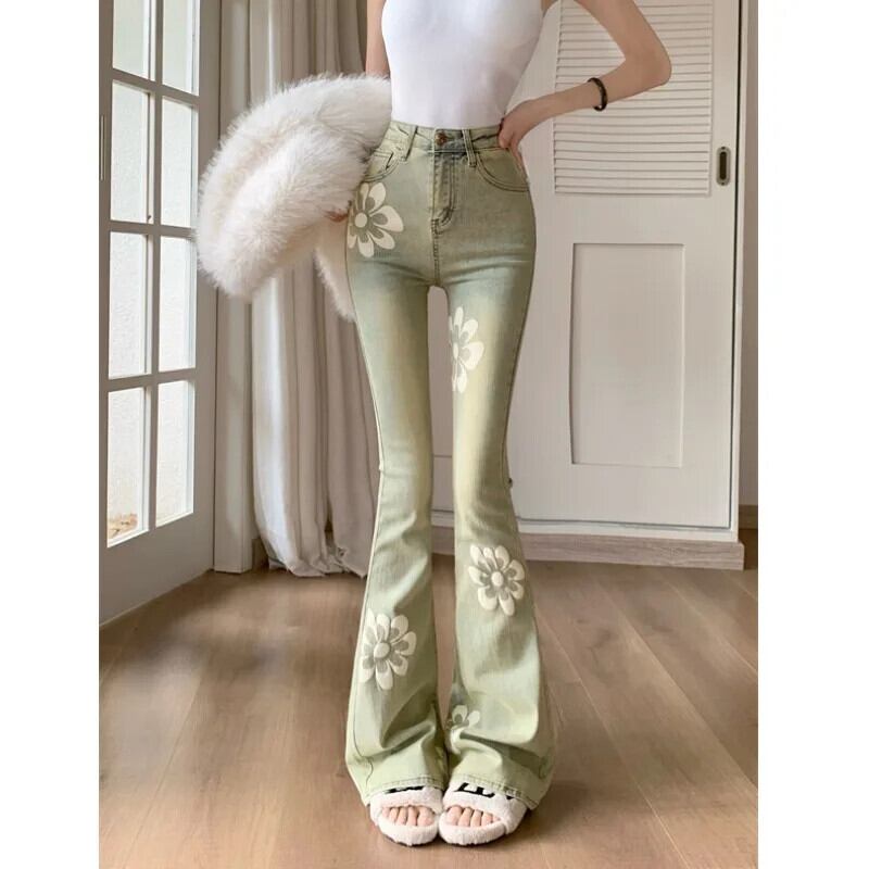 甘いホットガール花柄プリントダメージ加工ジーンズ秋レトロスリムフィットウエスト弾性フロアモップフレアパンツ レッド エラスティック 伸縮 大人ガーリー スウィート キュート カジュアル オータム 秋物