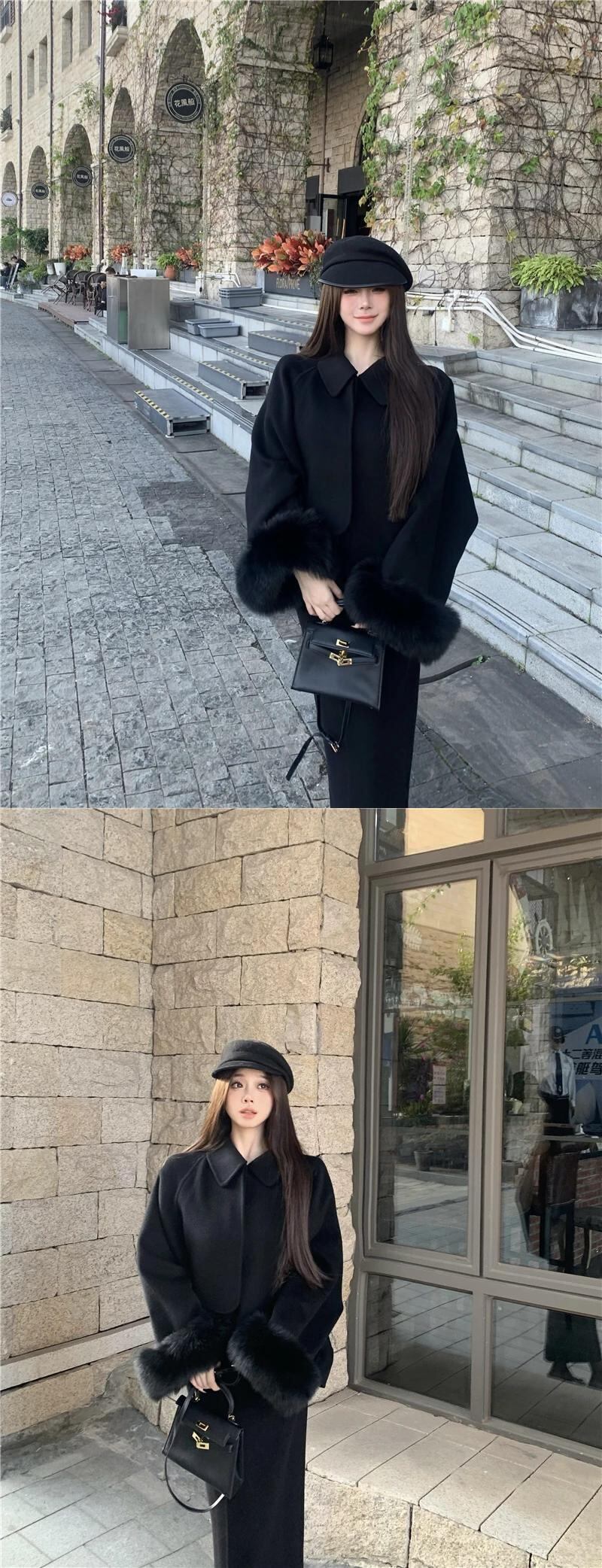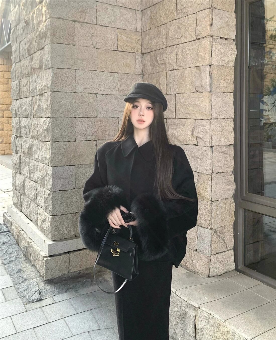 甘いホットガール黒パッチワークターンダウン襟ファージャケット冬ルーズスリーブショートウールコート ブラック 大人ガーリー スウィート キュート カジュアル ウィンター 冬物