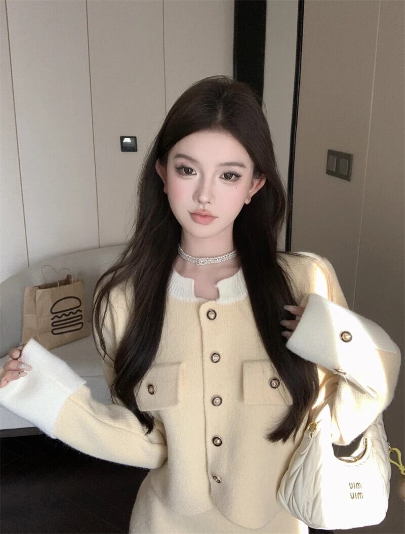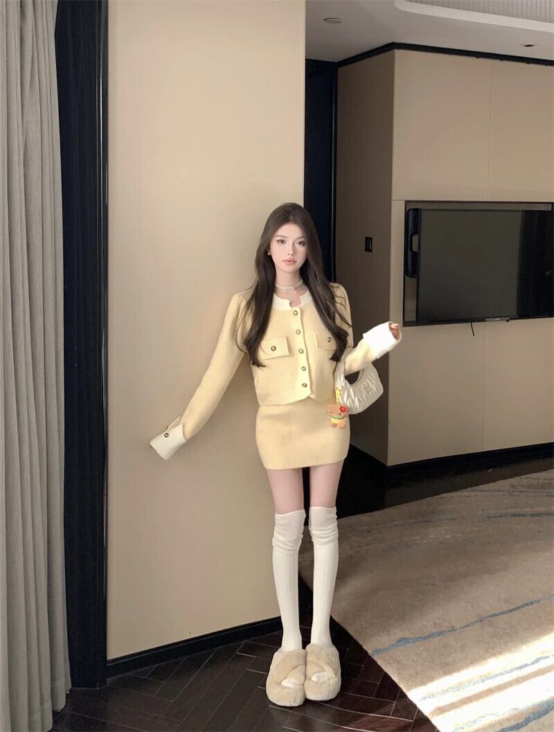 フレンチスイートホットガールレトロセット秋/冬 O ネックニットカーディガンウエストミニスカート 2 点セット 大人ガーリー スウィート キュート カジュアル オータム 秋物 ウィンター 冬物 Oネック