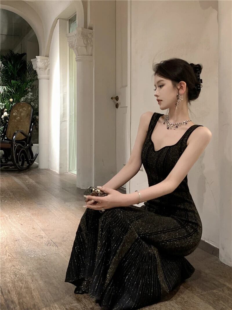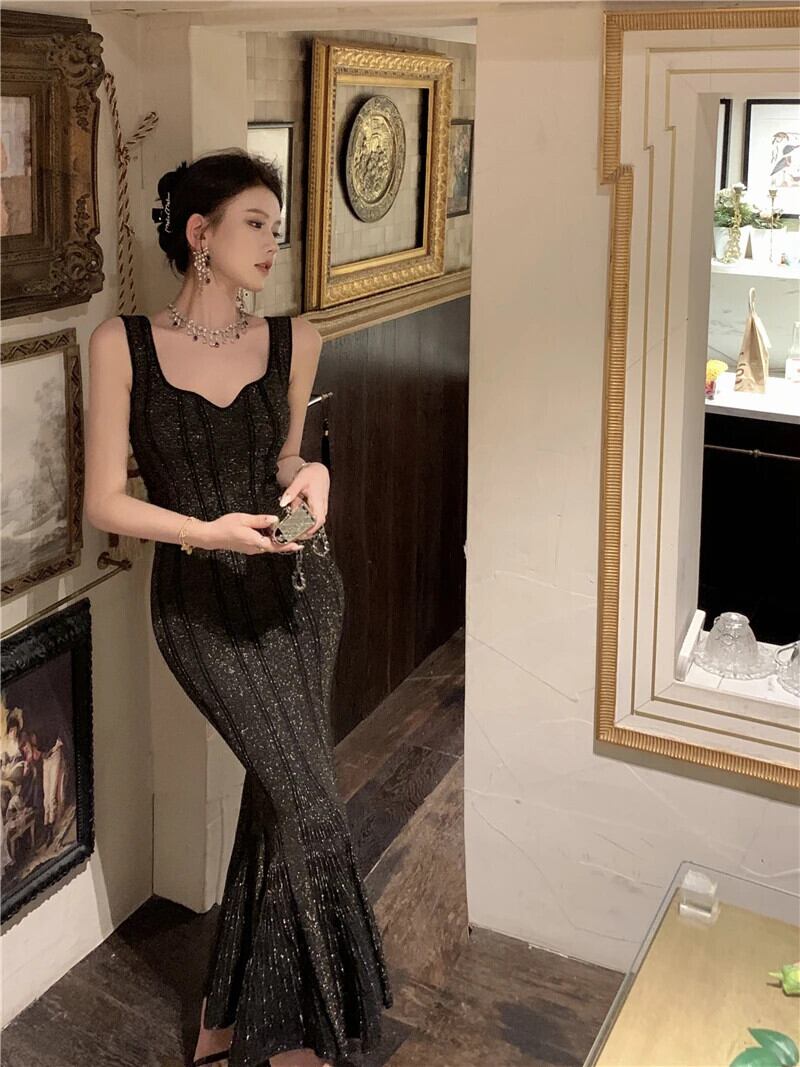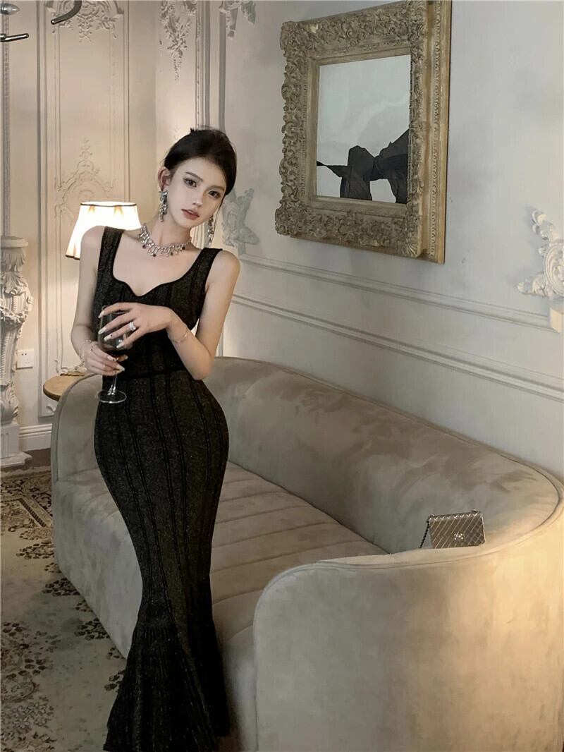 甘いホットガール黒スリムフィットイブニングドレス秋光高級ストラップニットマーメイドロングドレス ブラック 大人ガーリー スウィート キュート カジュアル オータム 秋物