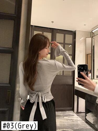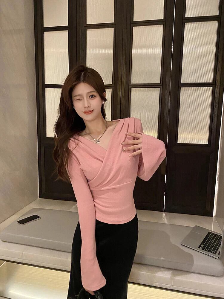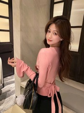 甘いホットガールクロスボウプリーツ Tシャツ冬 V ネック長袖底プルオーバートップ ロング リボン 大人ガーリー スウィート キュート カジュアル ウィンター 冬物 Vネック